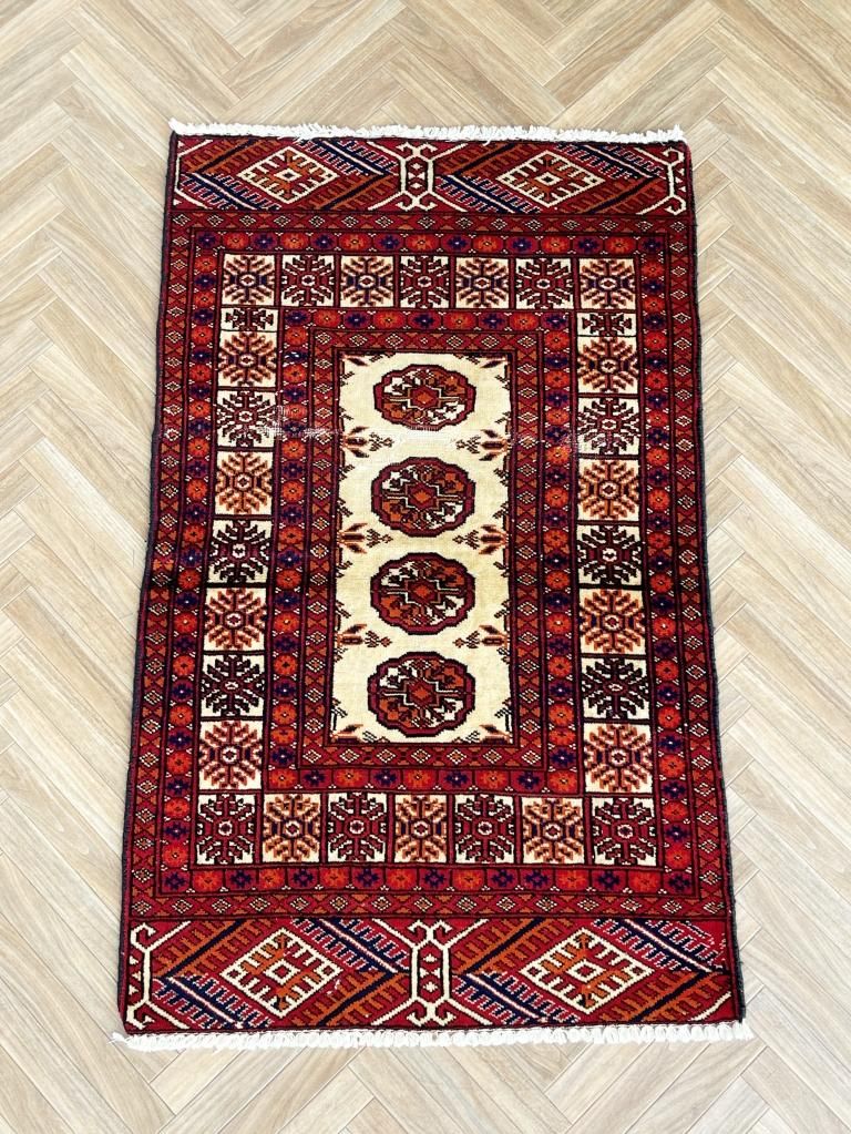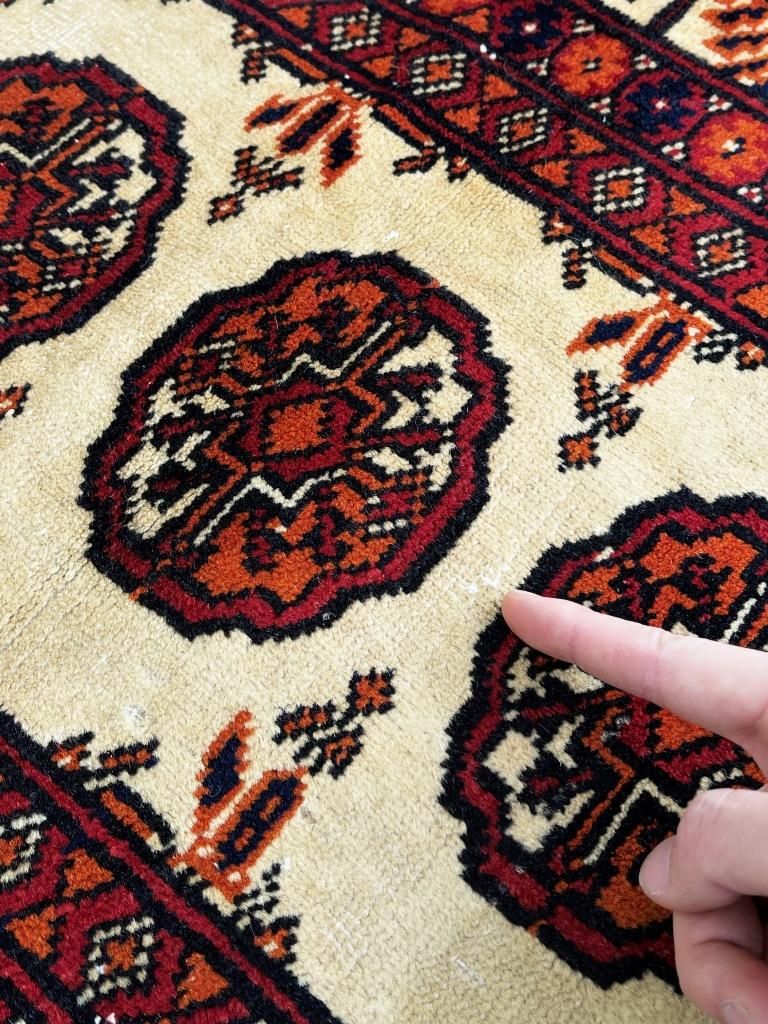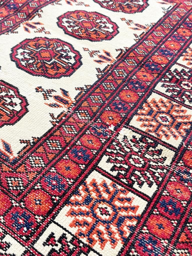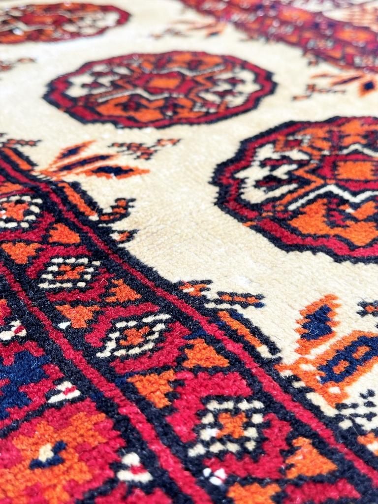 パキスタンラグの特徴である花のような図柄が規則的に並んだ可愛らしい一枚です。
