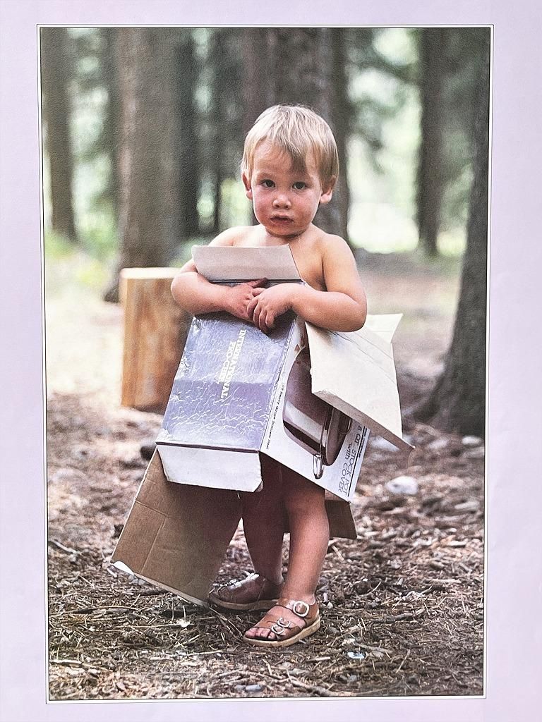 鍋の梱包用の段ボールの中にすっぽりと入った子どもがこちらを見つめる目が印象的です。