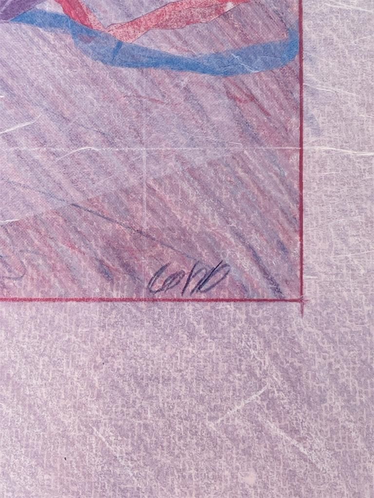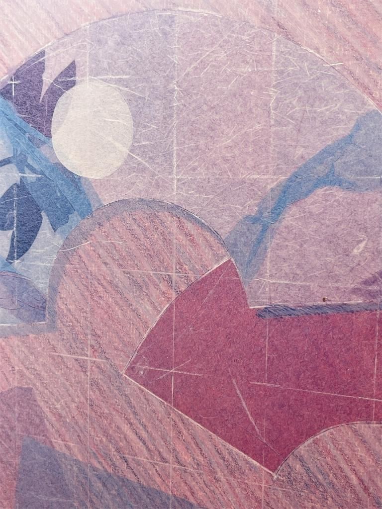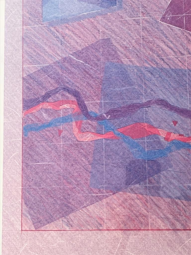 綺麗なピンクやブルーなどで描かれた抽象的なデザインが目を引く一枚。