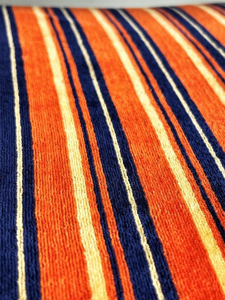 タオル生地の様なファブリックで、オレンジやネイビーのストライプ柄が目を引くカラーリングです。