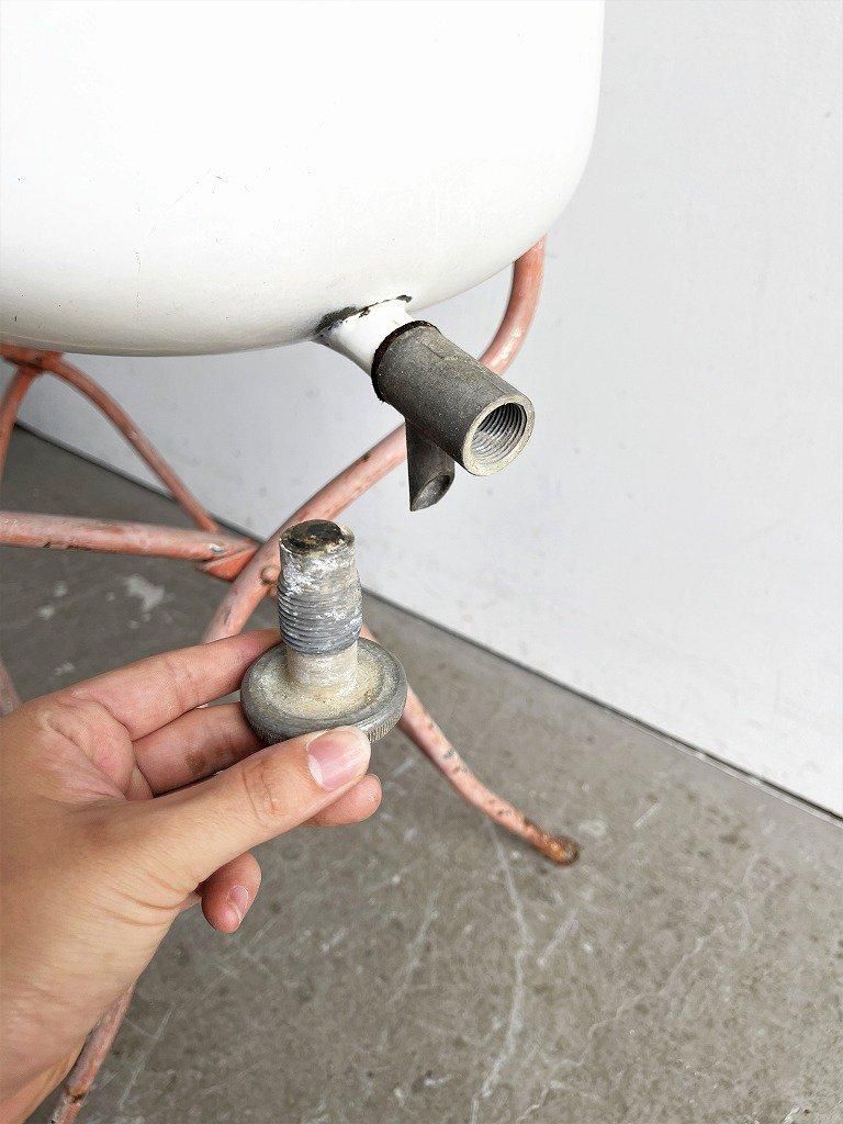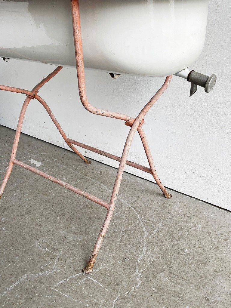 バスタブはホワイトのホーロー製、ベースはくすんだピンクのスチール製で折り畳みが可能です。