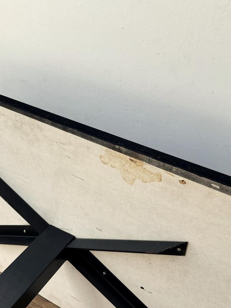 天板はウッドにアルミが被さってるような質感で、脚はキャスター付きで移動可能の便利な一品。