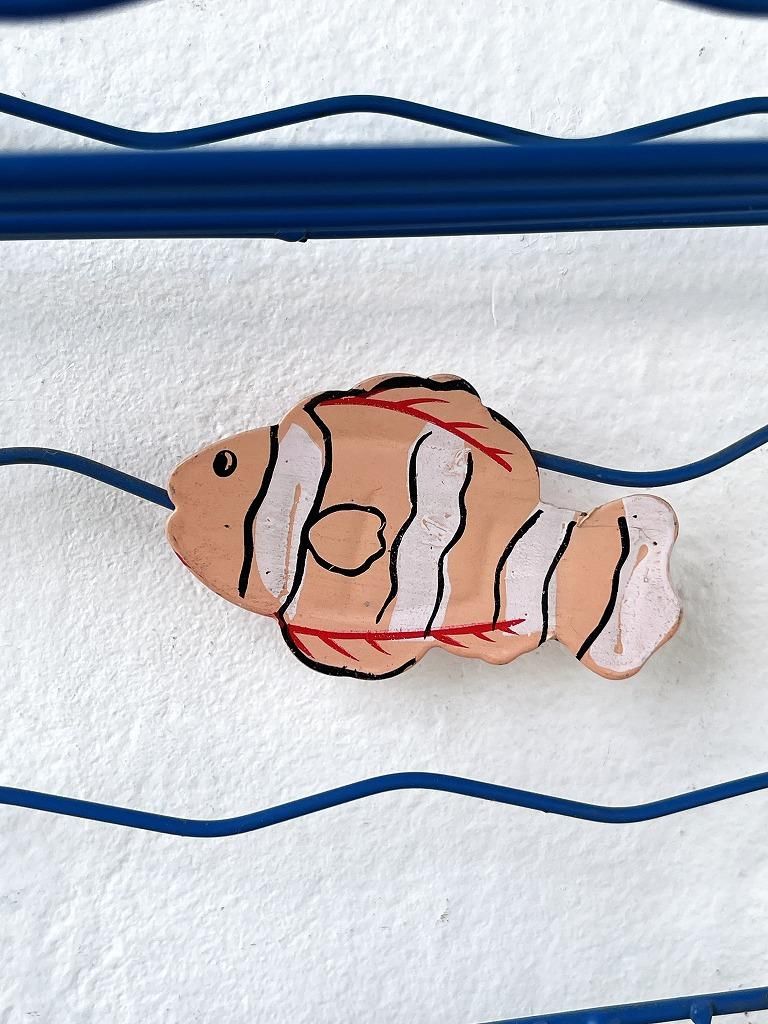 すっきりとした細身のブルーのフレームに、小魚がデザインされた一品。