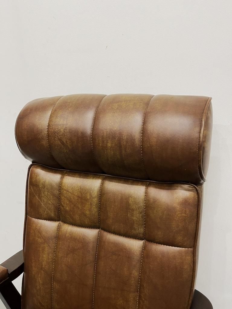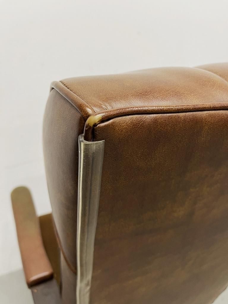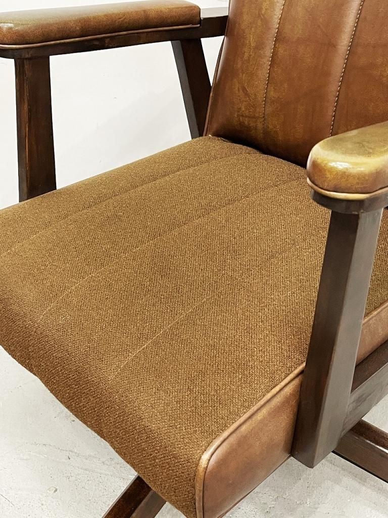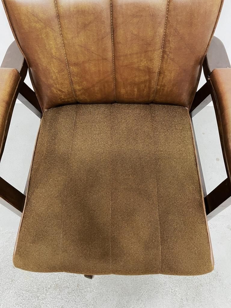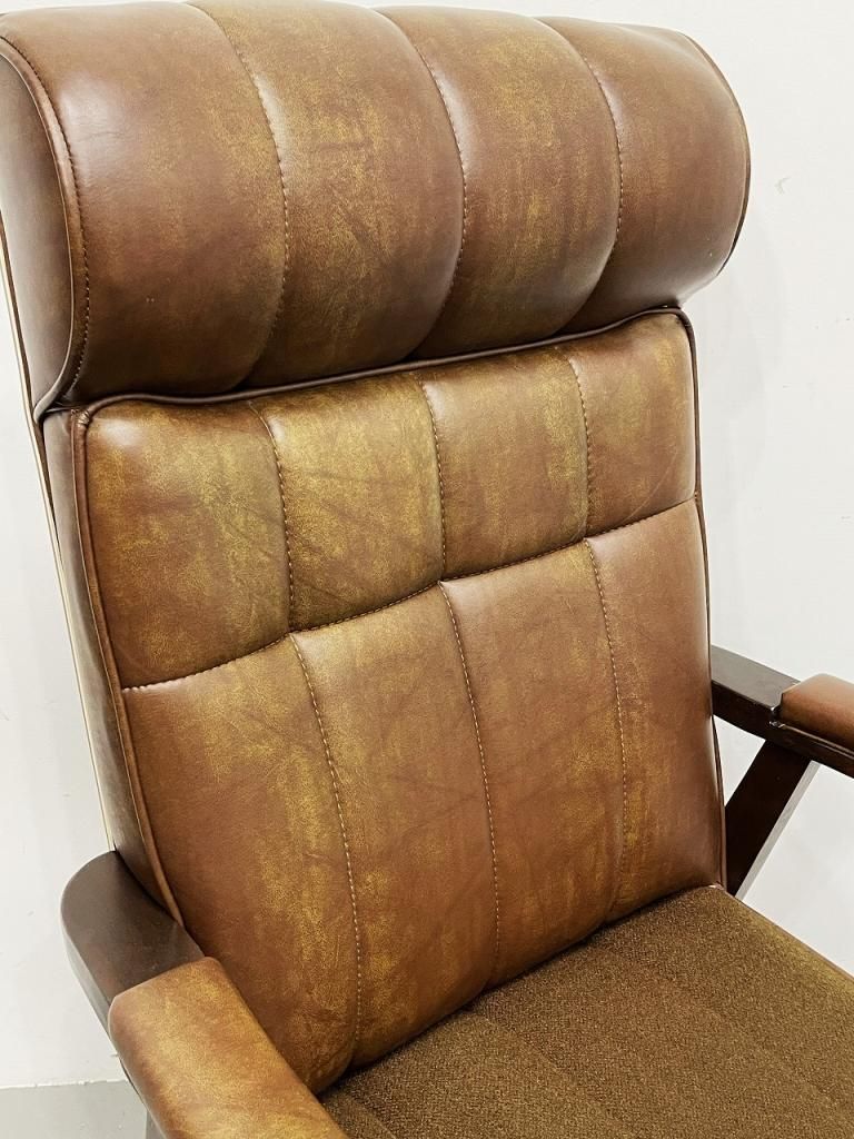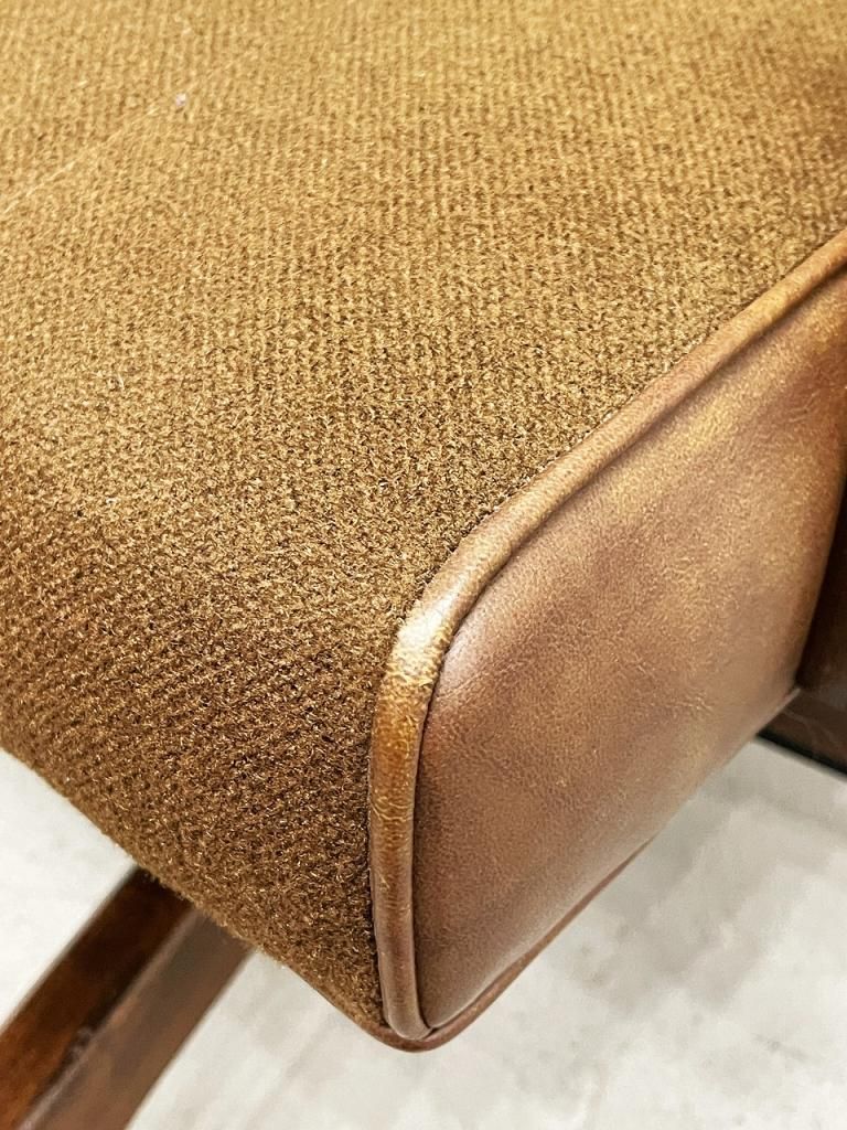 肉厚なブラウンのビニールレザー製の背もたれに、座面はファブリックに切り替わったデザイン。