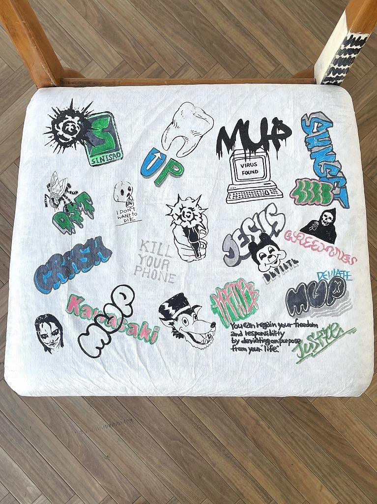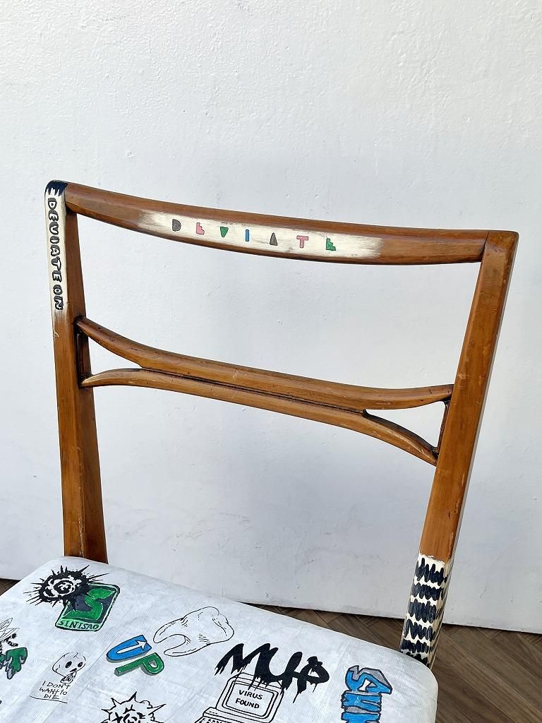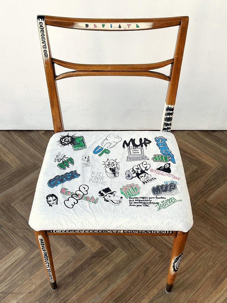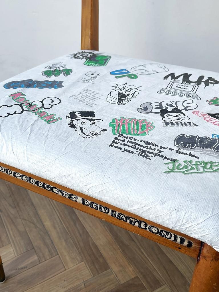 座面にはフランスのデュポン社が開発した紙のような質感の耐久性の高い素材のタイベックが貼られており、オリジナルフォントやイラストなど芸術の本流からは逸脱したカウンターカルチャーであるストリートアートの要素がプラスされたペイントが施されたひと品。