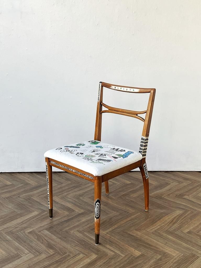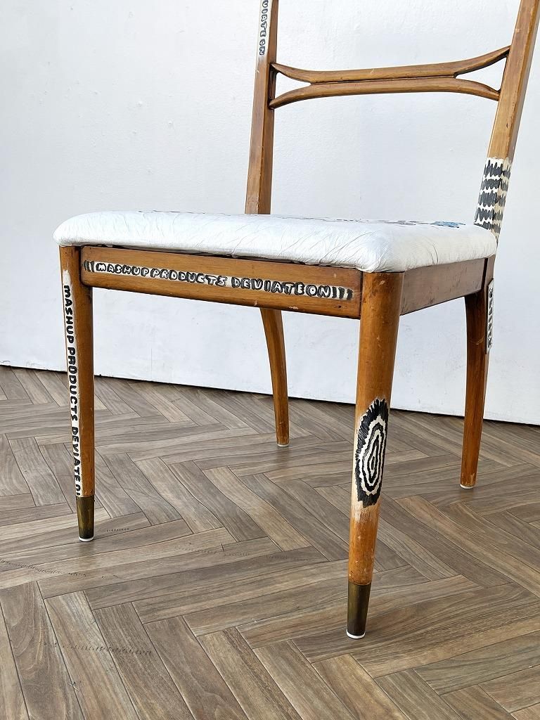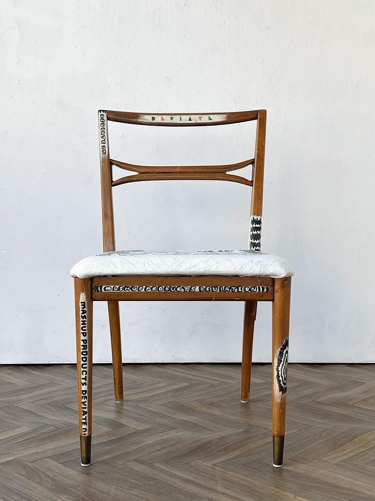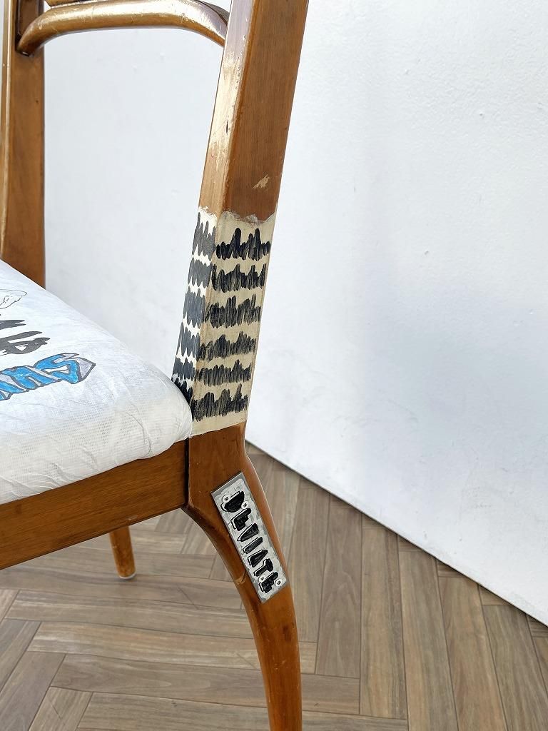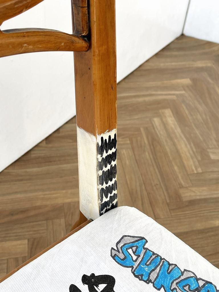 座面にはフランスのデュポン社が開発した紙のような質感の耐久性の高い素材のタイベックが貼られており、オリジナルフォントやイラストなど芸術の本流からは逸脱したカウンターカルチャーであるストリートアートの要素がプラスされたペイントが施されたひと品。