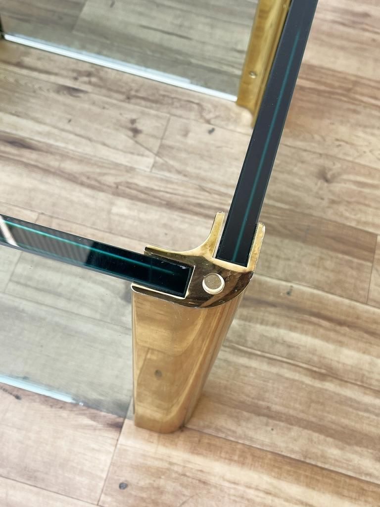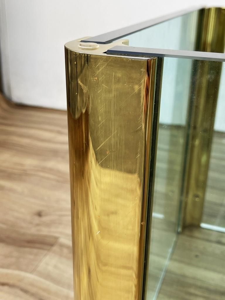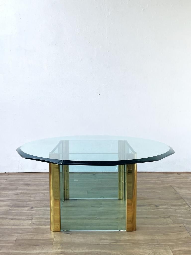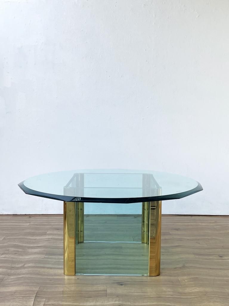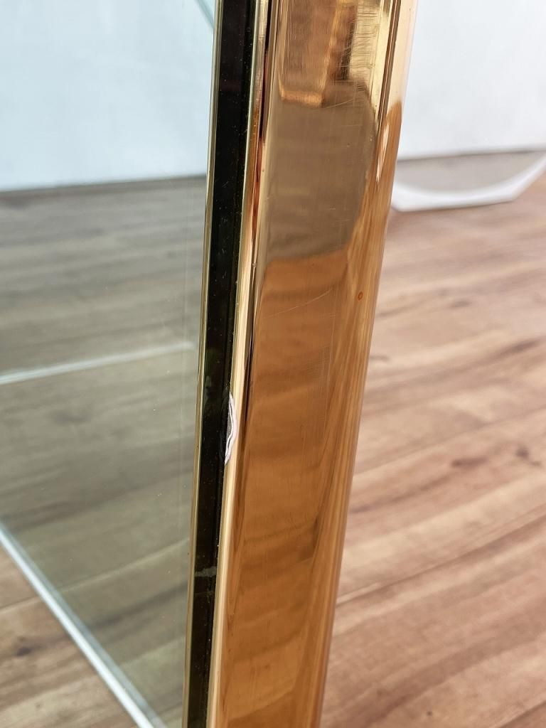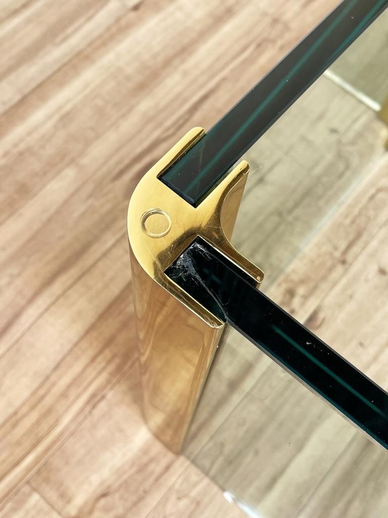 4本のゴールドの支柱にガラス板が施されたベースと、滑らかなドデカゴン型(12角形)の天板の組み合わせ。