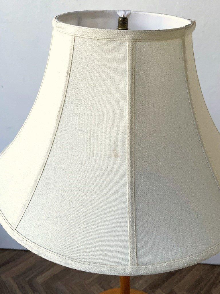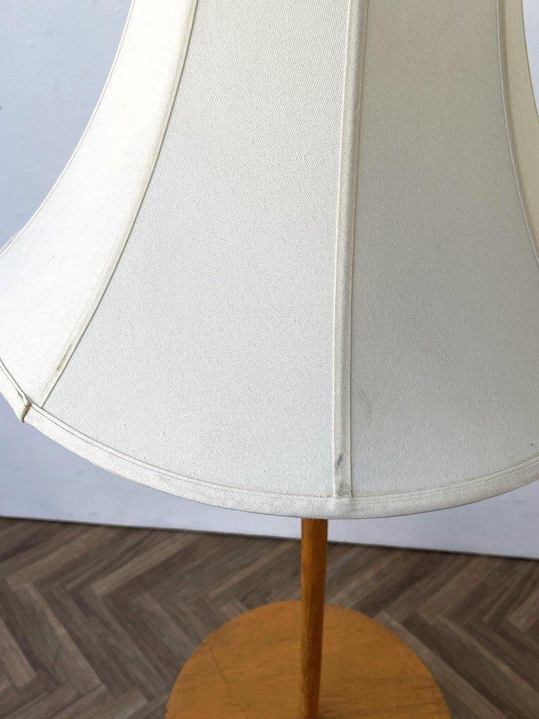 ナチュラルな色味のウッドベースに、薄いベージュカラーのファブリックシェードの組み合わせ。