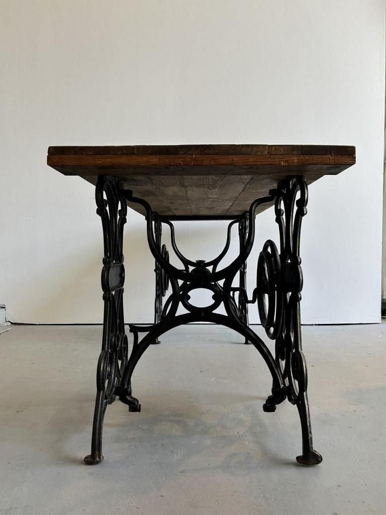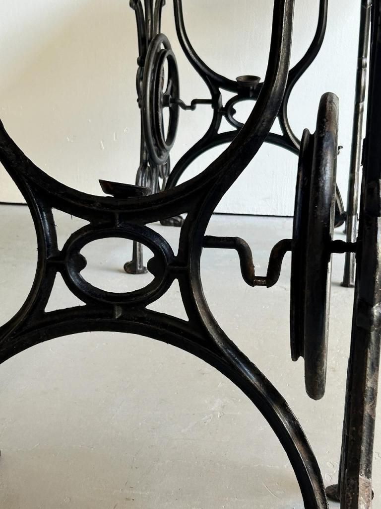 曲線を多用した装飾的なフレームと、しっかりとした重量感が特徴で、かつては足踏みミシンとして使われ、現在はその堅牢さとデザイン性を活かし、テーブルの脚として再構築されています。