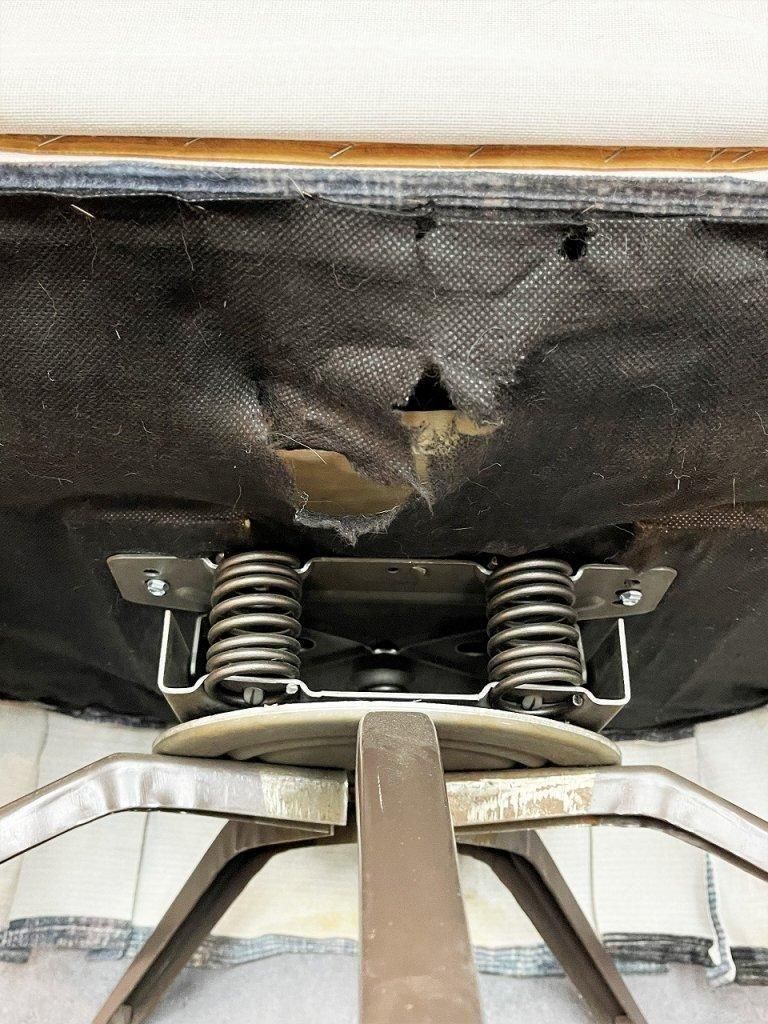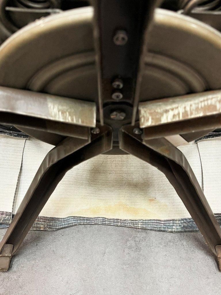 座面は360度回転式で、座面裏にはスプリングが付いており、後ろに体重をかけるとゆらゆらとロッキング出来る作り。