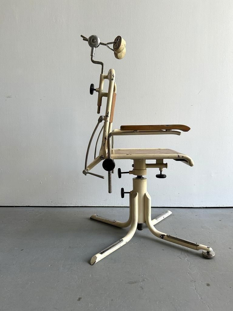 恐らく歯科医院や、耳鼻咽喉科などで使用されていた施術用チェアで、患者に身体に合わせて各部を細かく調整できるのは必須の機能でしょう。