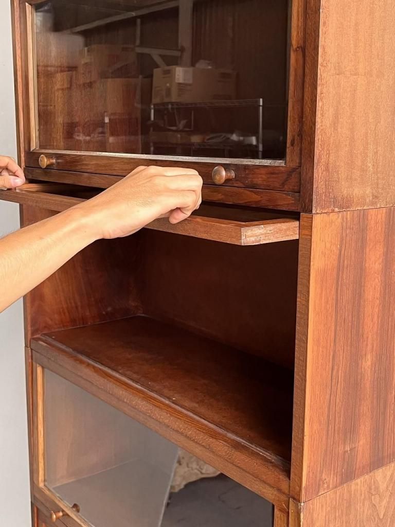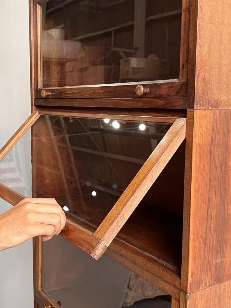 スライドアップ式の扉となっており、扉を前方に開いて上にスライドインする構造で、ガラス扉になっていることにより、本や資料を守りながらも見せる収納として、知的でクラシックな印象を与えます。