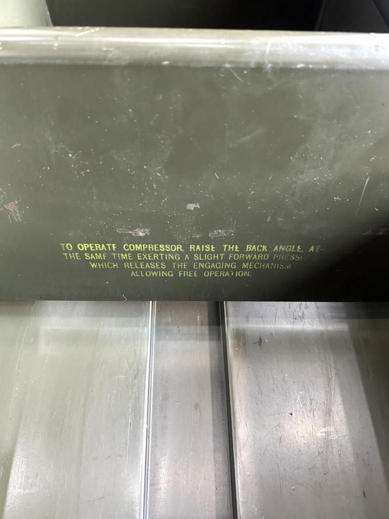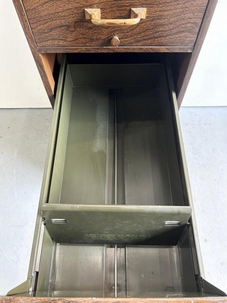 前面には真鍮色のハンドルとラベルフレームが備えられ、引き出し内部には「compressor」機構(書類を押さえるバネ式仕切り)が残り、実際のオフィスワークに対応した作りです。底部には Steel Office Furniture Institute の規格プレートが付属しており、アメリカの事務什器として公式に品質保証を受けていたことがわかります。