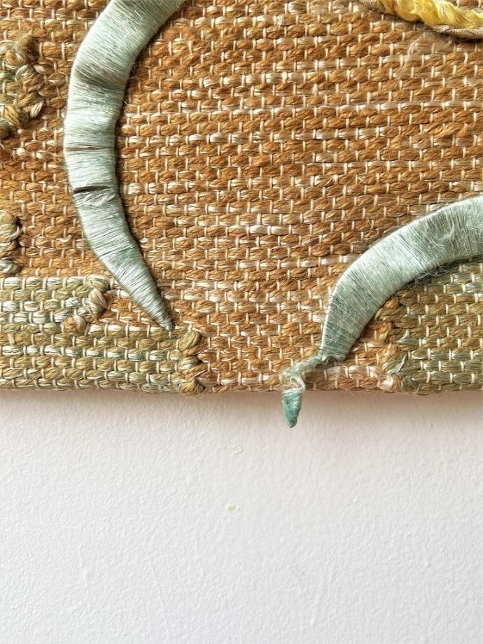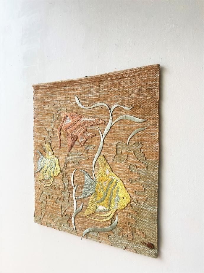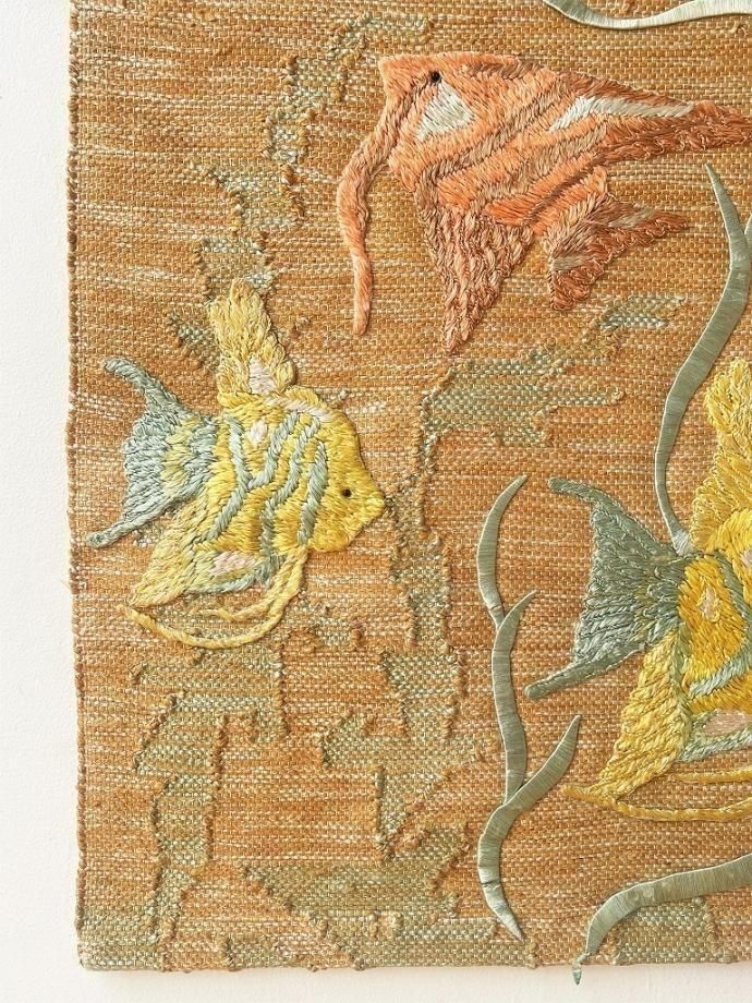 魚や水草部分が立体的に織られおり、平織りの背景とのコントラストが強調されています。