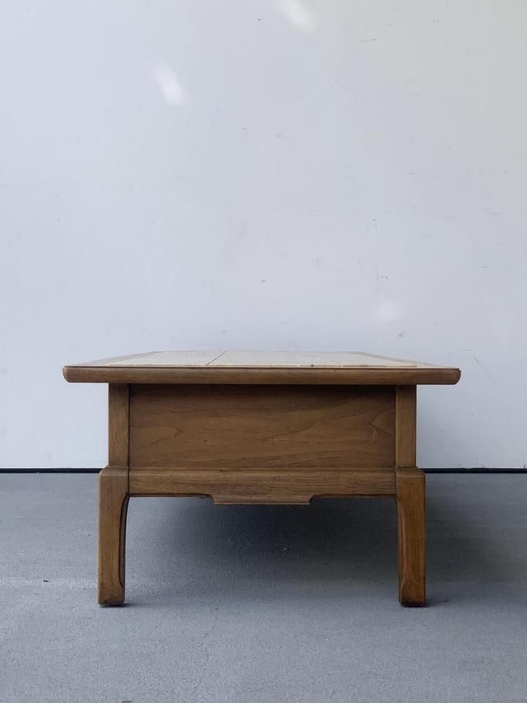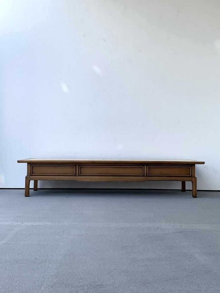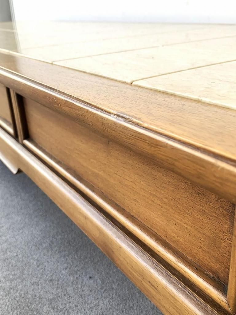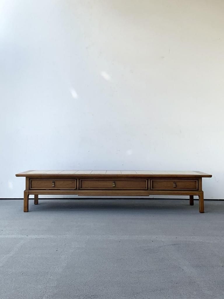 シャープな直線やタイルでモダンな印象ですが、引き出し部分にモールディング加工が施され取っ手には真鍮パーツを使用。モダンをベースにディティールにクラシックな装飾性を加えたThomasville社らしい1台です。