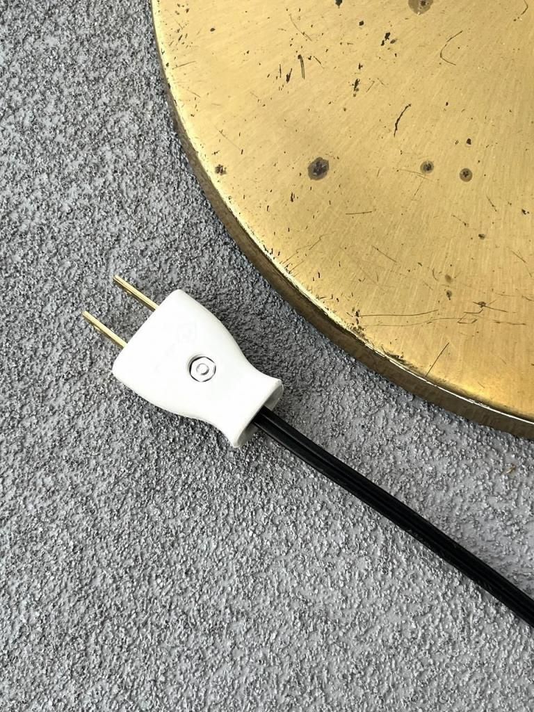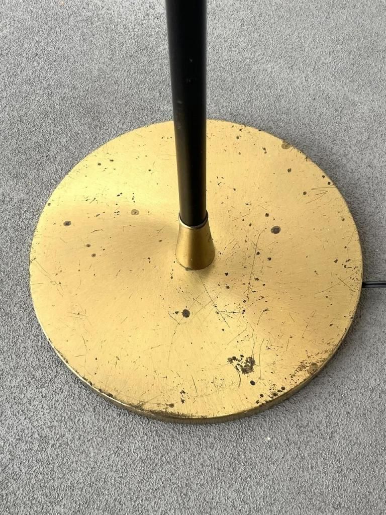 真鍮パーツとブラックの支柱で、モダンでありながら高級感を与える典型的なミッドセンチュリーデザインです。支柱は細長いため空間を圧迫せず、家具の脇やコーナーに置いても綺麗に収まります。