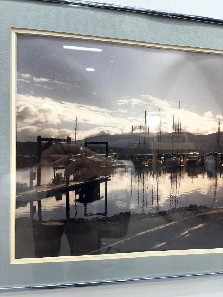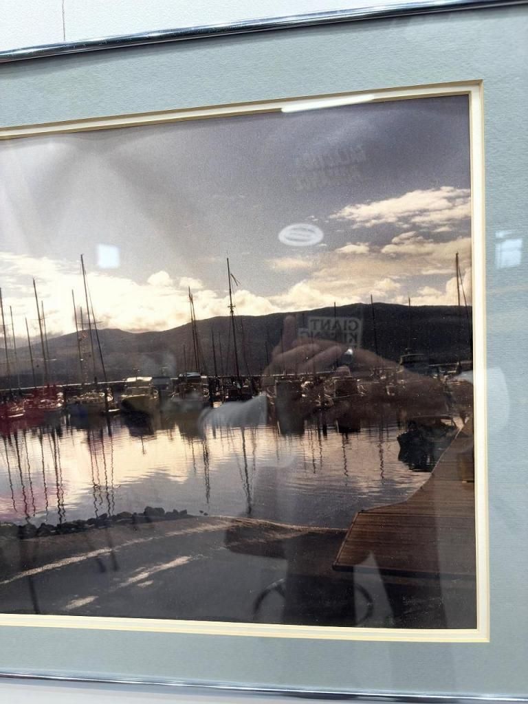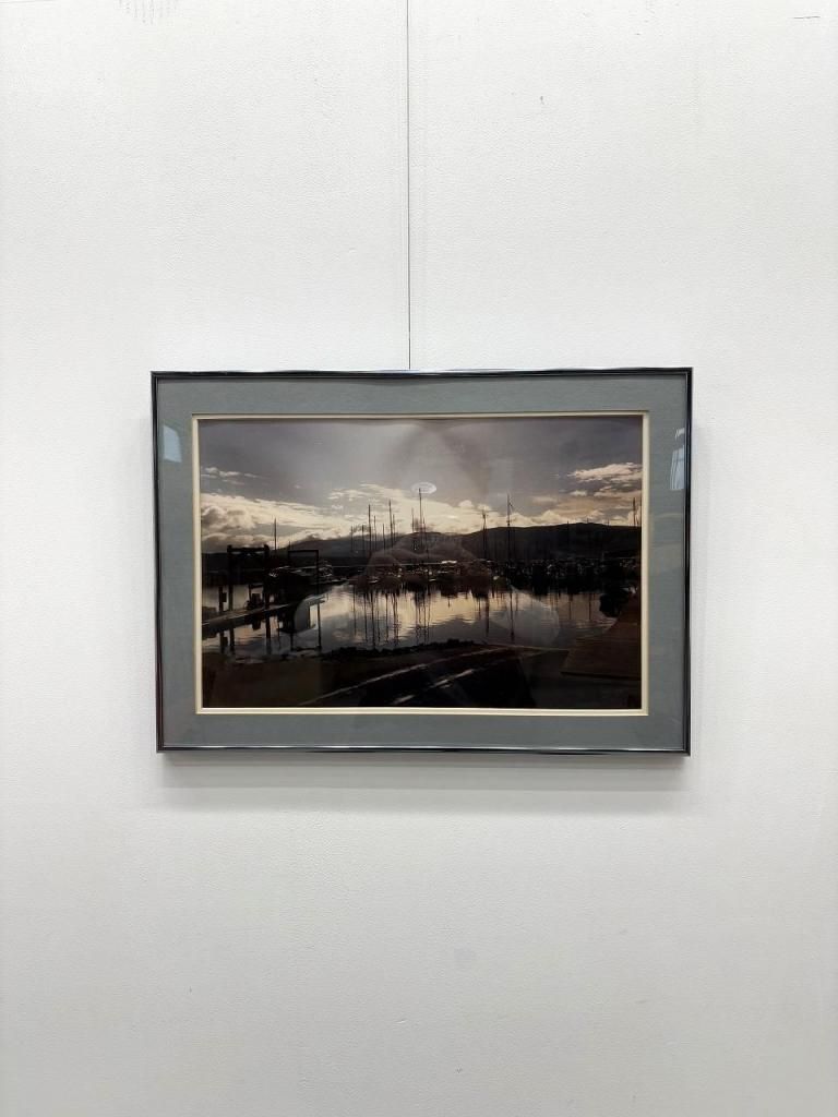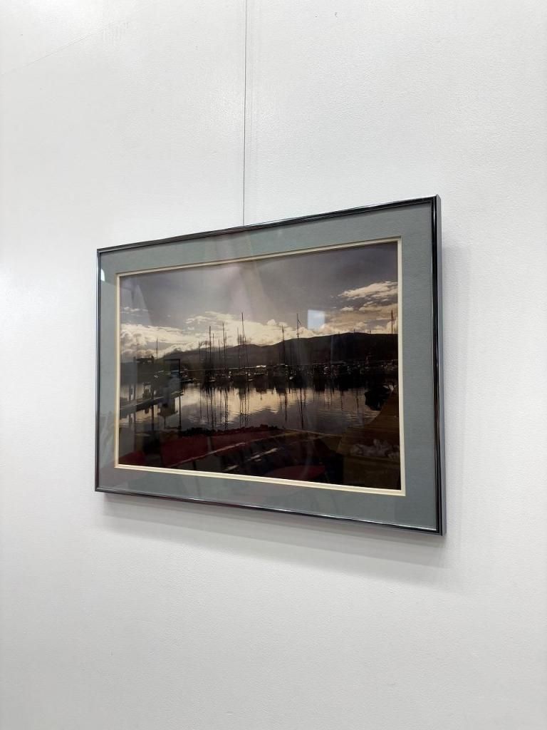 夕暮れ時の港町を切り取ったようなフォトプリントで、穏やかな水面に映り込むヨットや空模様が美しいコントラストを描き出しています。