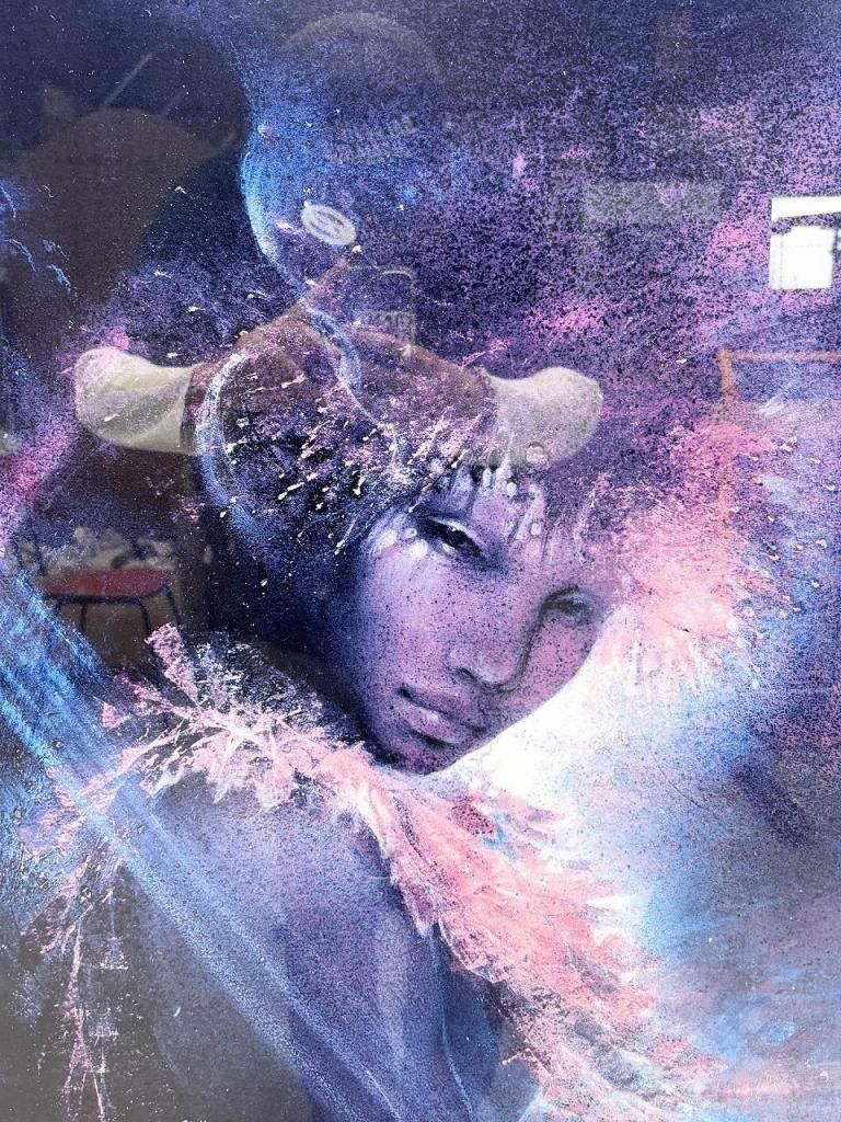 ハワイ神話に登場する火山の女神 ペレ を題材に描かれた一枚で、ブルーとパープルを基調にした幻想的な色彩表現が特徴です。神秘的な表情を浮かべる女性像は、火山の炎と大地のエネルギーをまとい、自然と神話が織り交ざるような力強さと静けさを感じさせます。