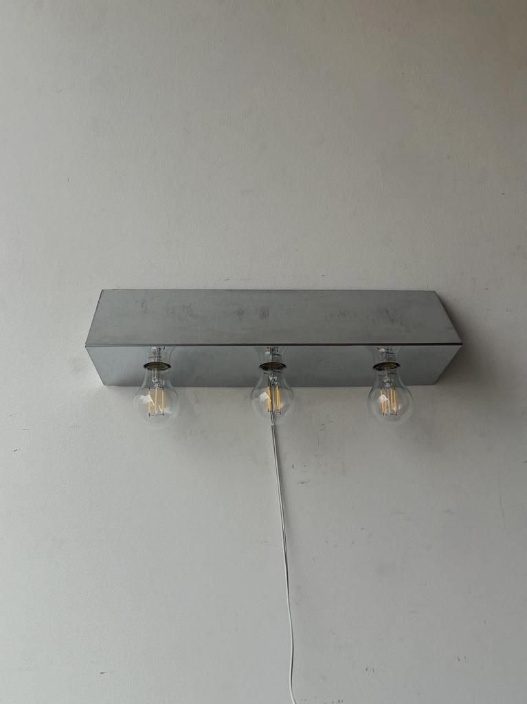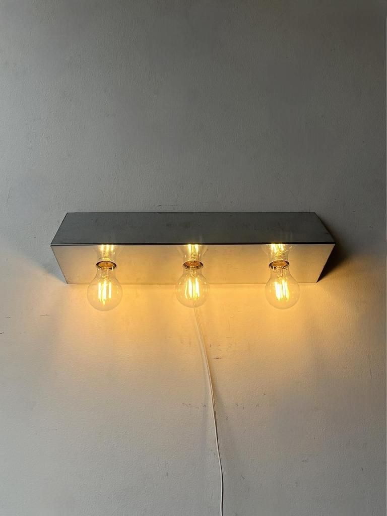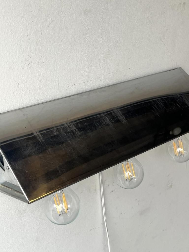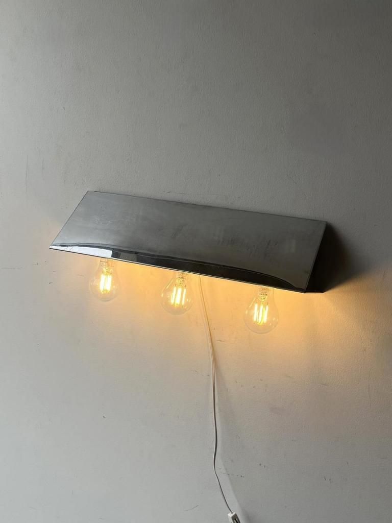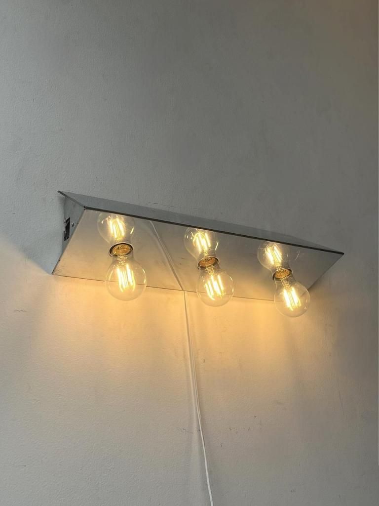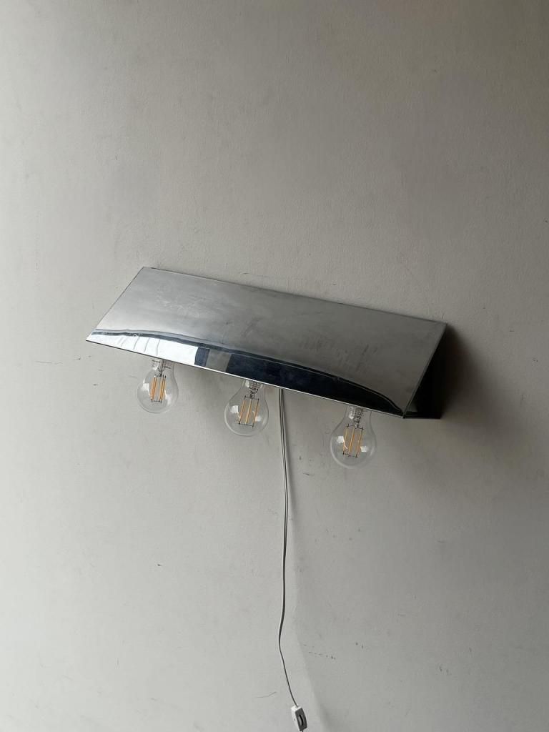鏡面仕上げのクロームボディに、裸電球をそのまま見せるミニマルな構成が印象的な一灯。