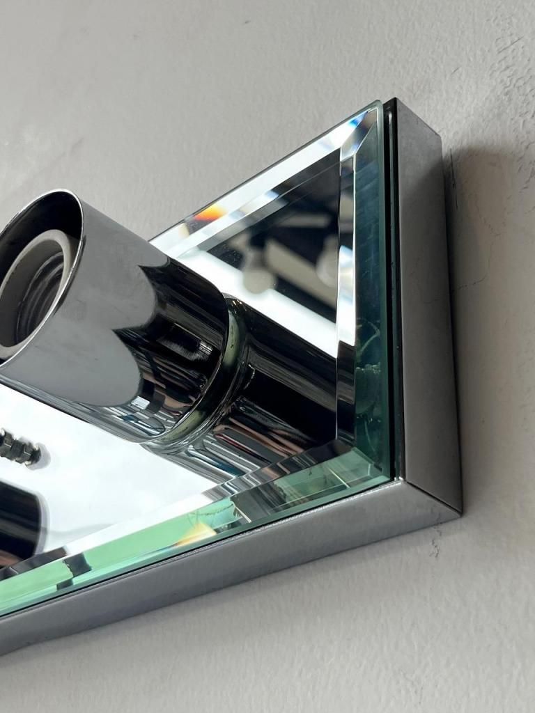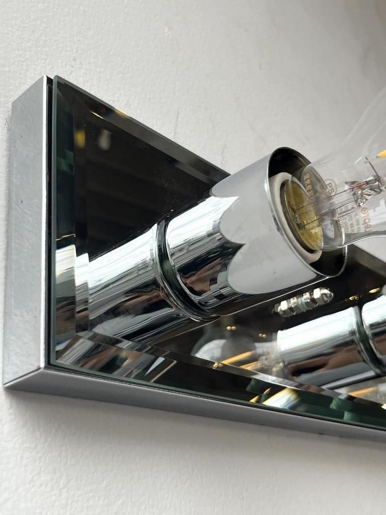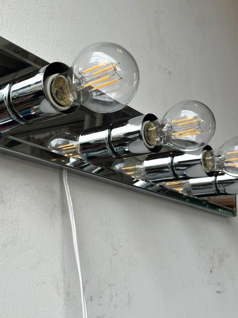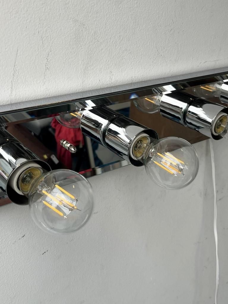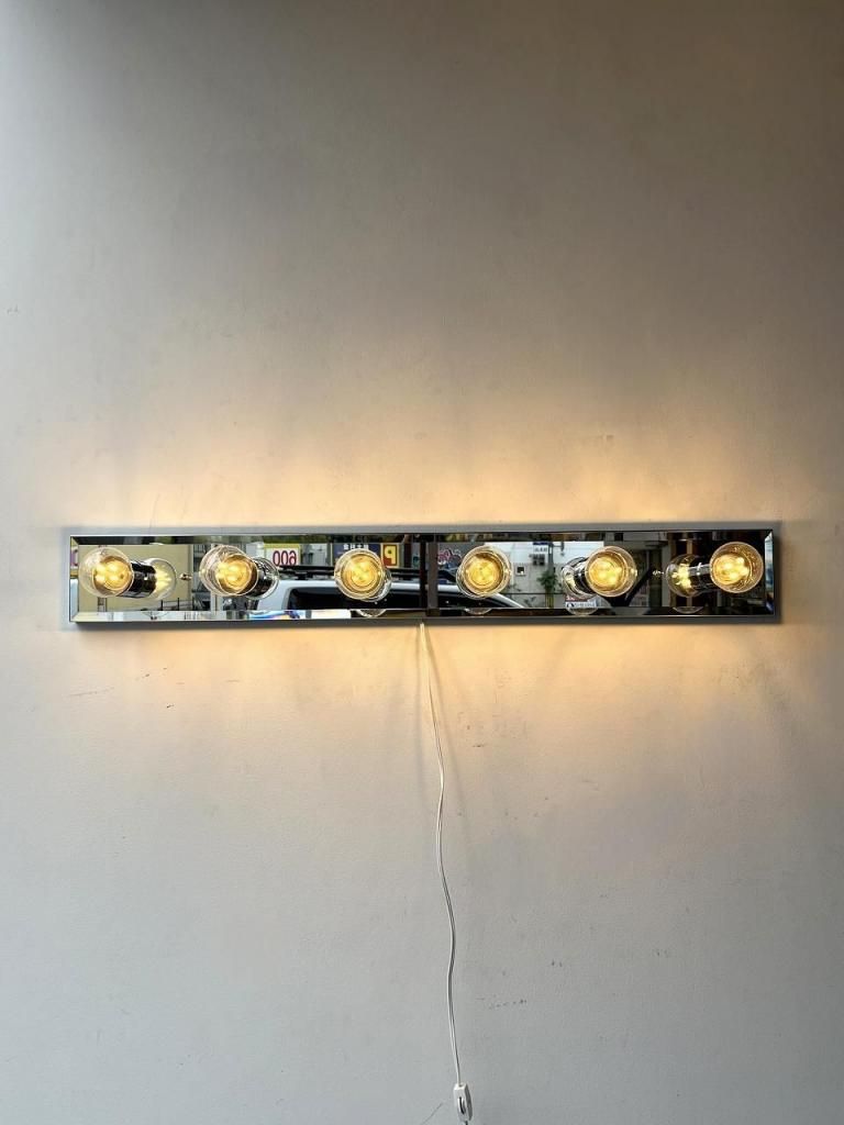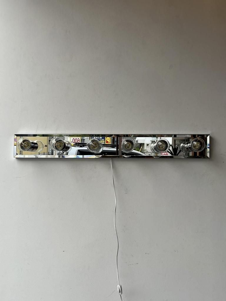 クロームの輝きとミラーの反射が互いを引き立て合い、点灯時には光が壁面に広がりながら奥行きを感じさせます。