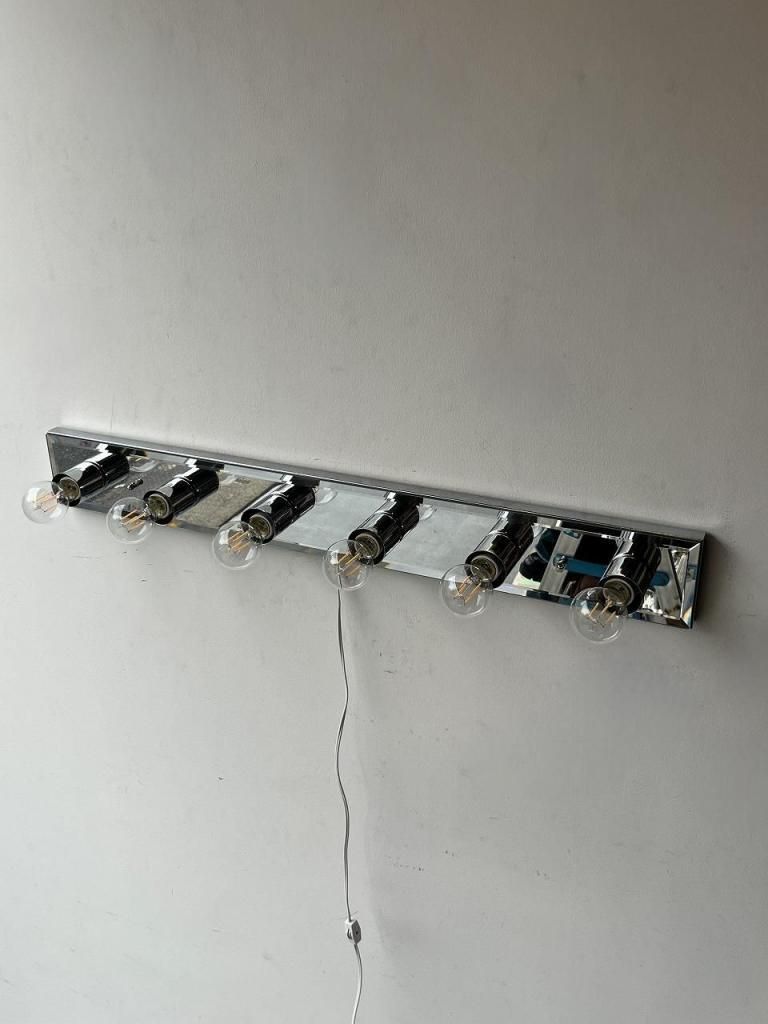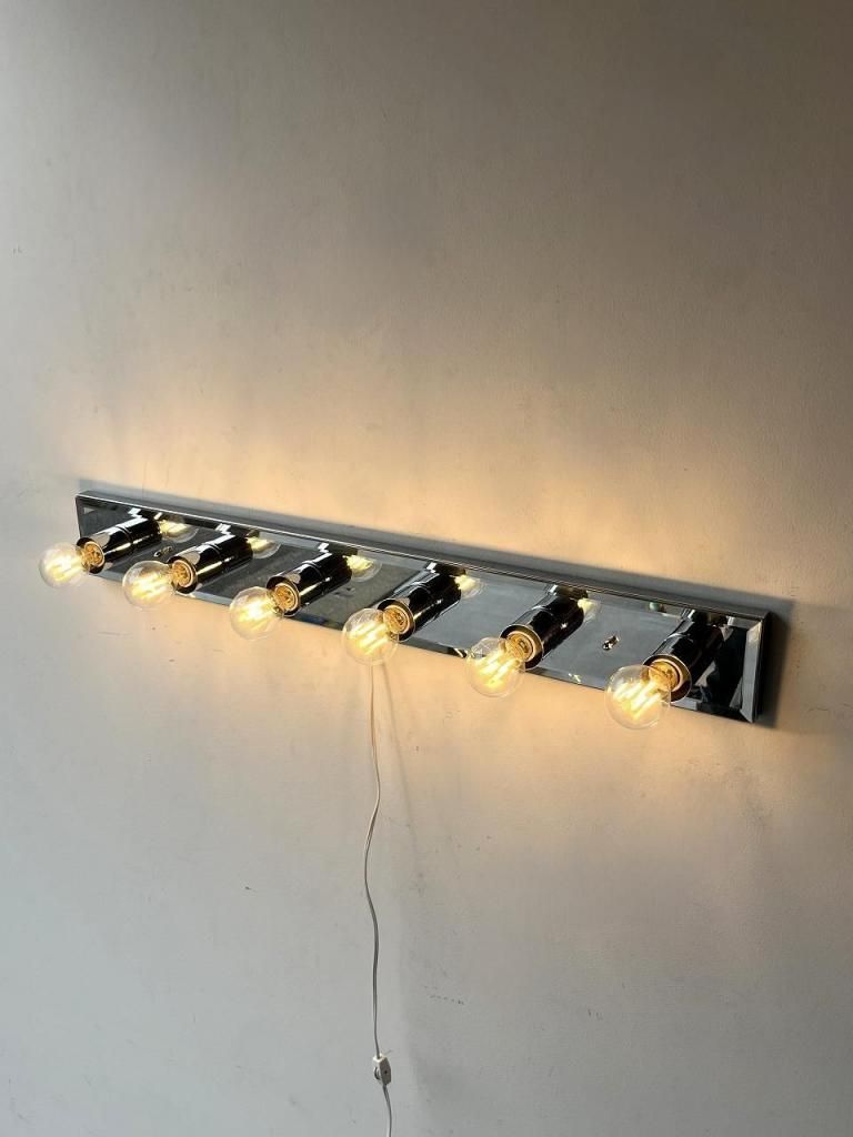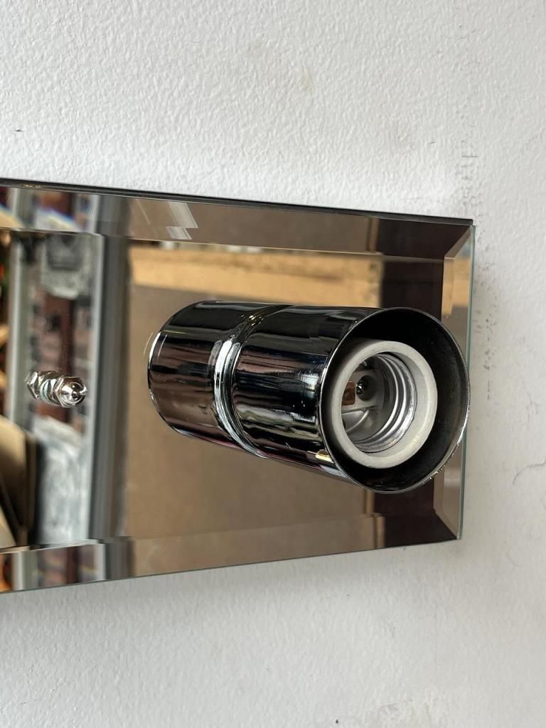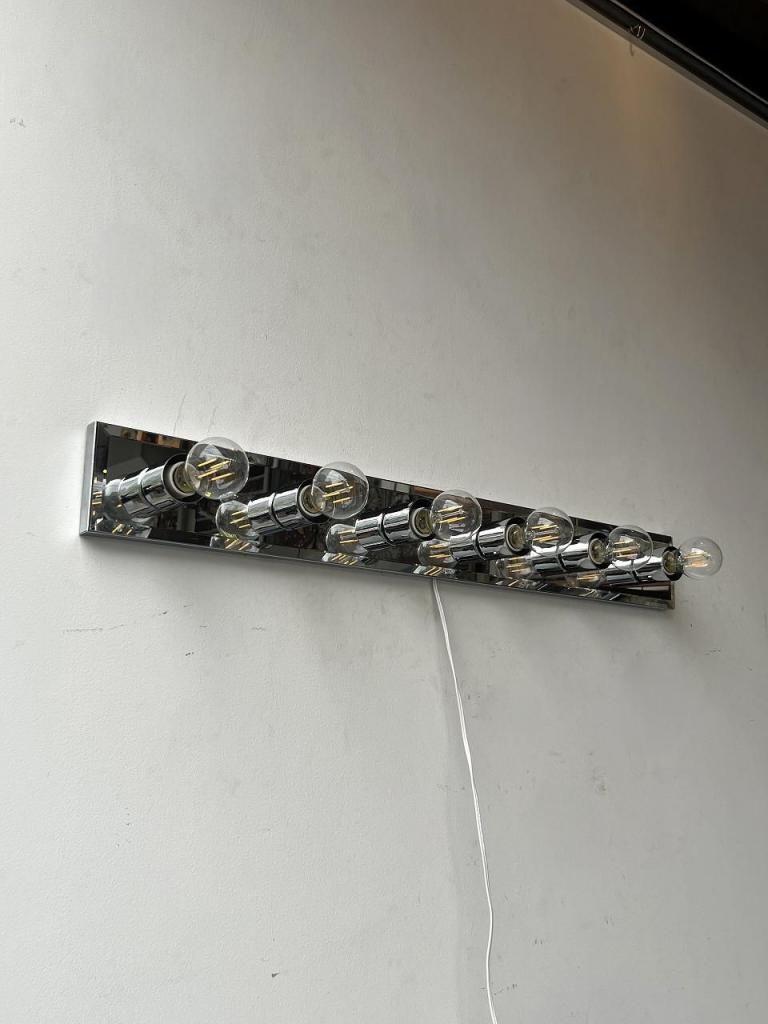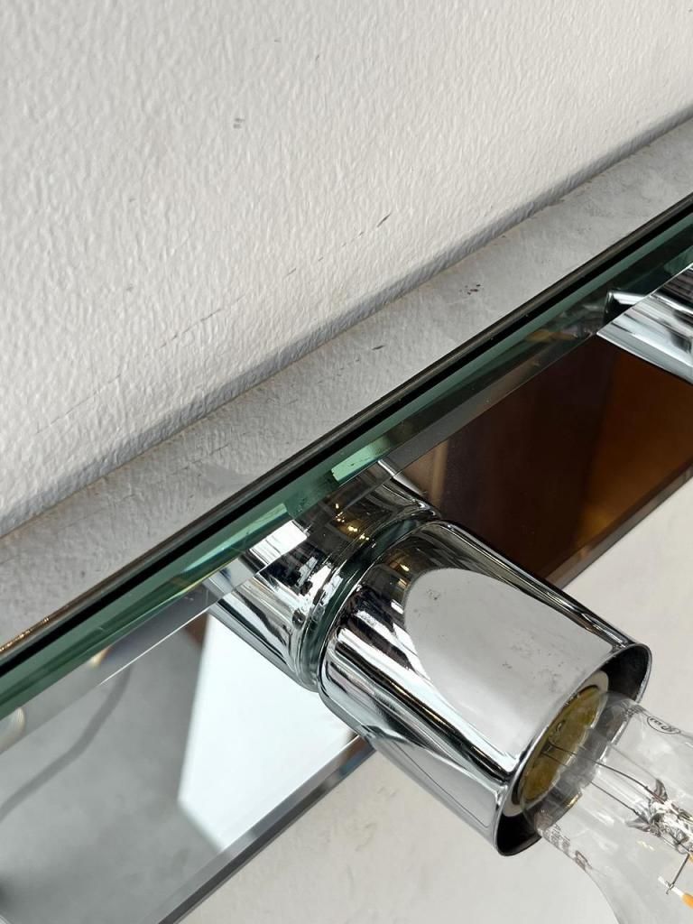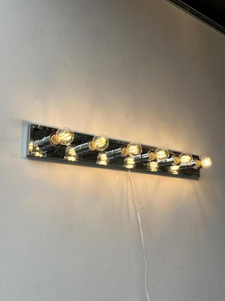 クロームの輝きとミラーの反射が互いを引き立て合い、点灯時には光が壁面に広がりながら奥行きを感じさせます。