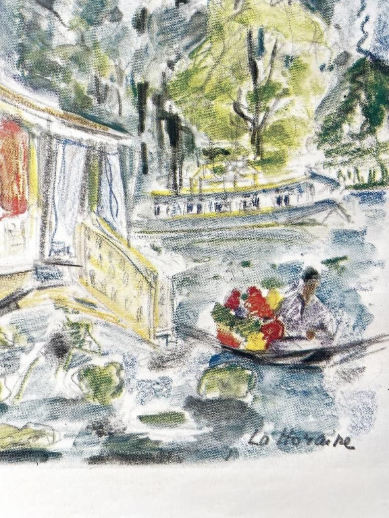 中央には水辺の建物と船の風景が描かれ、建物の細部を描きつつも色彩や線が自由で柔らかく、印象をそのまま紙に写し取った旅行スケッチのような印象です。