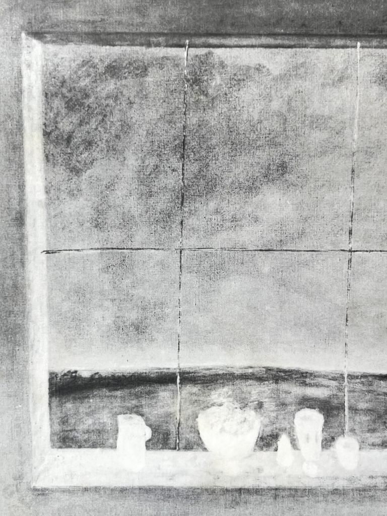 中央にはグレーをベースに、窓辺に花瓶や小物が置かれた静物画のようなミニマルで静謐な雰囲気が伝わる作品が描かれています。