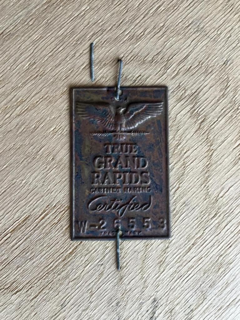 裏面に"True Grand Rapids Cabinet Making Certified"と書かれた品質保証プレートが施されており、1910-1960年代頃に一定の品質基準を満たした家具に付けられています。