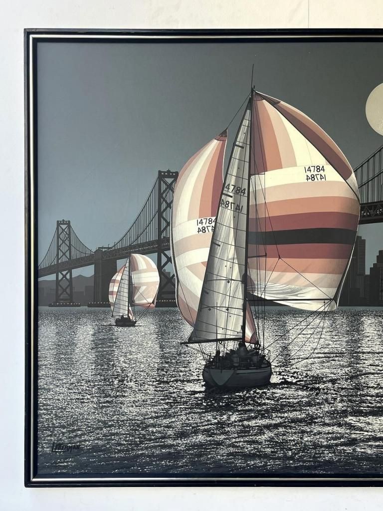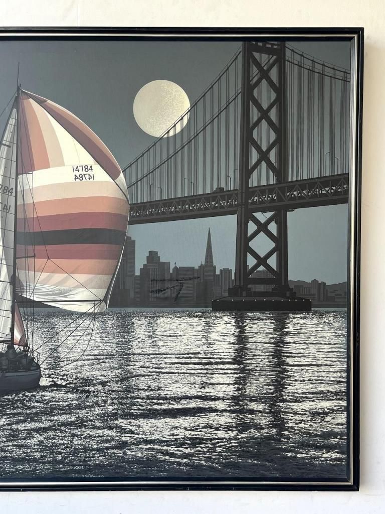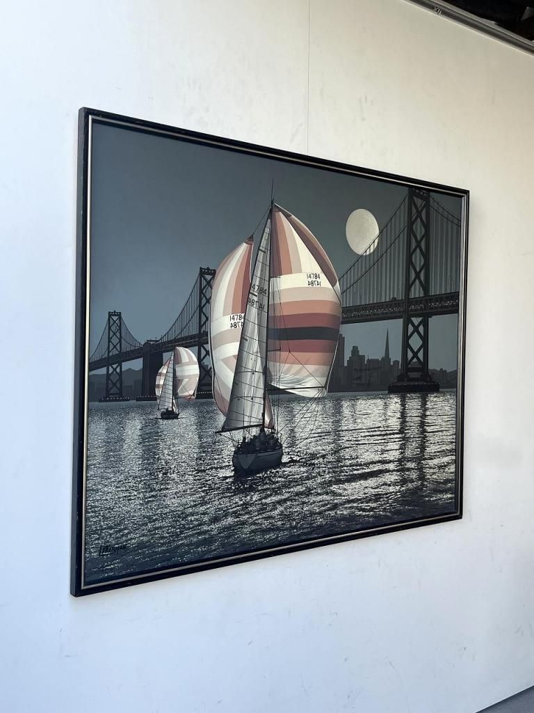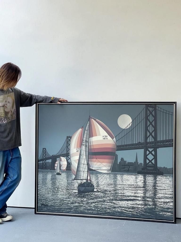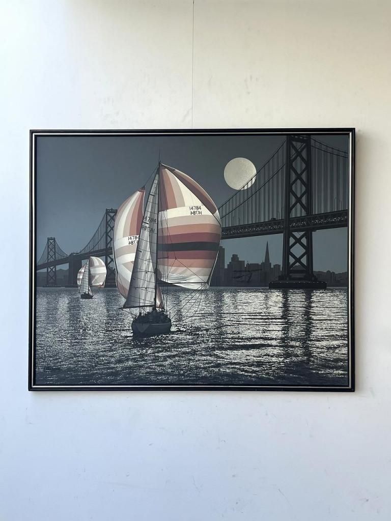 夜の海に浮かぶヨットと、サンフランシスコ・ベイブリッジが鮮明に描かれており、緻密なタッチの秀逸さを感じる1枚。