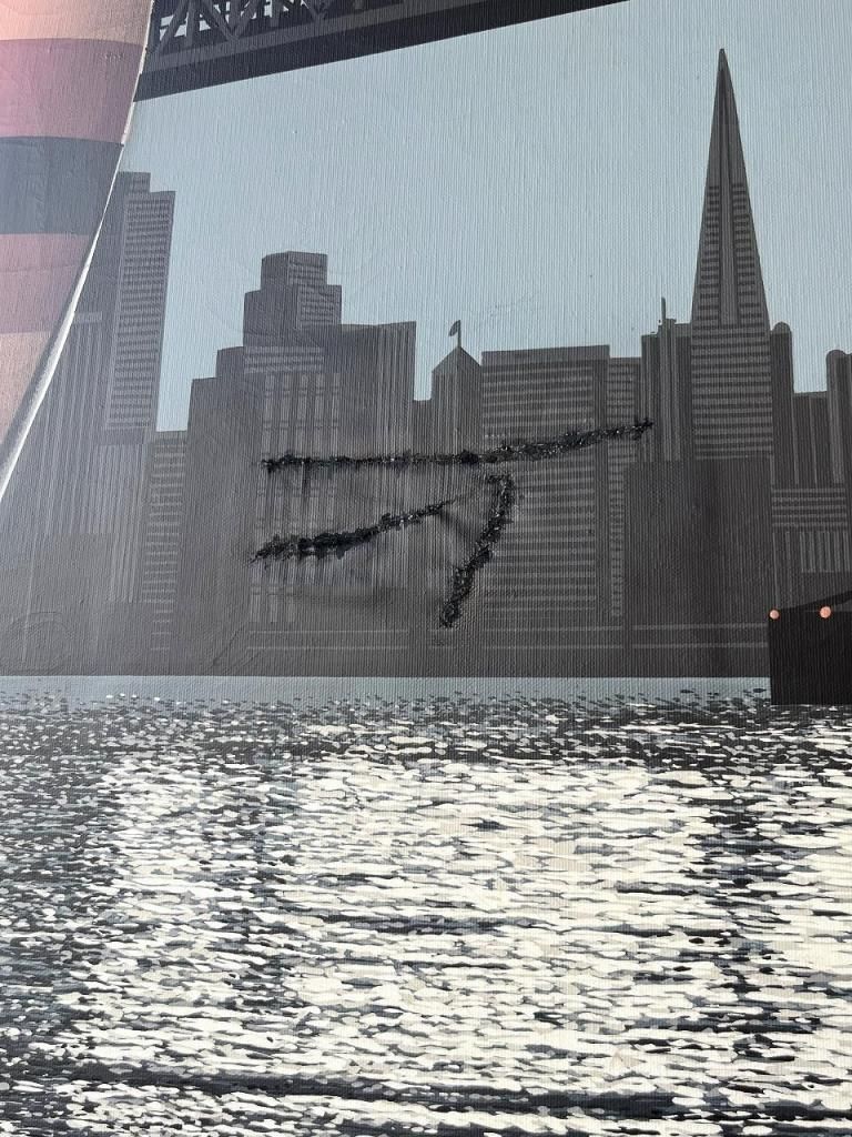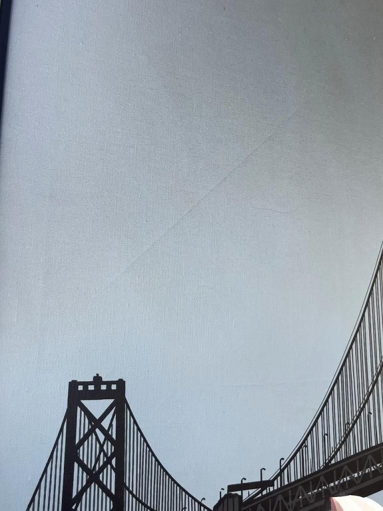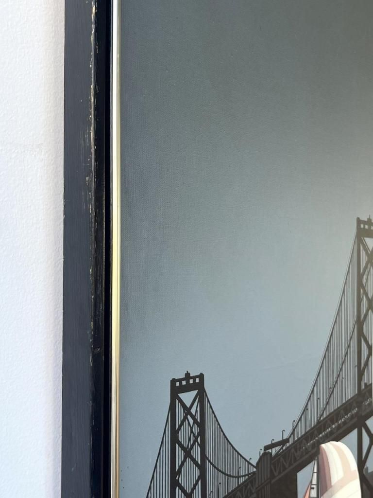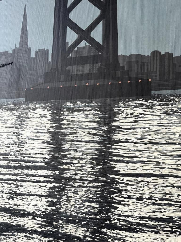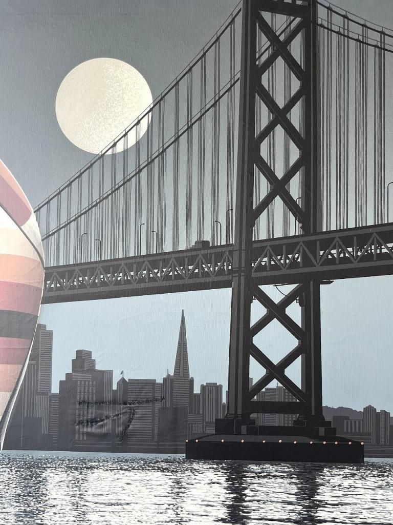 夜の海に浮かぶヨットと、サンフランシスコ・ベイブリッジが鮮明に描かれており、緻密なタッチの秀逸さを感じる1枚。