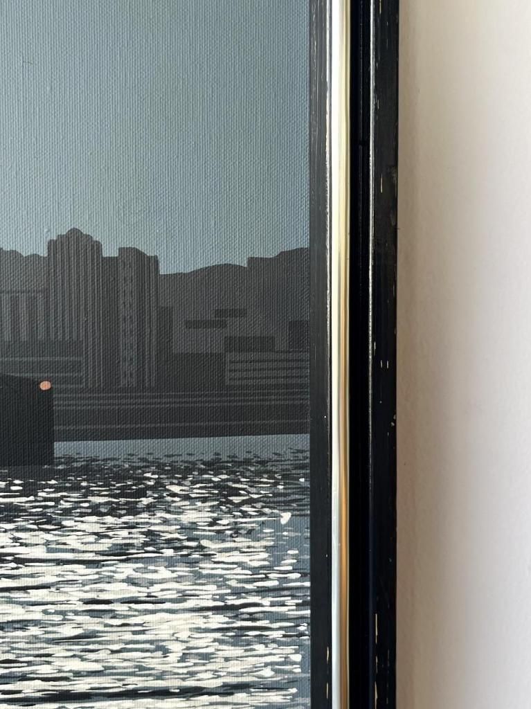 奥行きを演出するようにビル群は遠景ほど淡く描かれ、海面には月光が精緻に反射し、まるで写真を切り取ったかのような一瞬を、緻密なタッチで描き出しています。