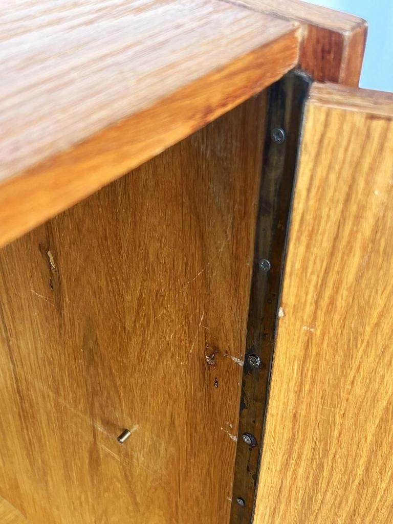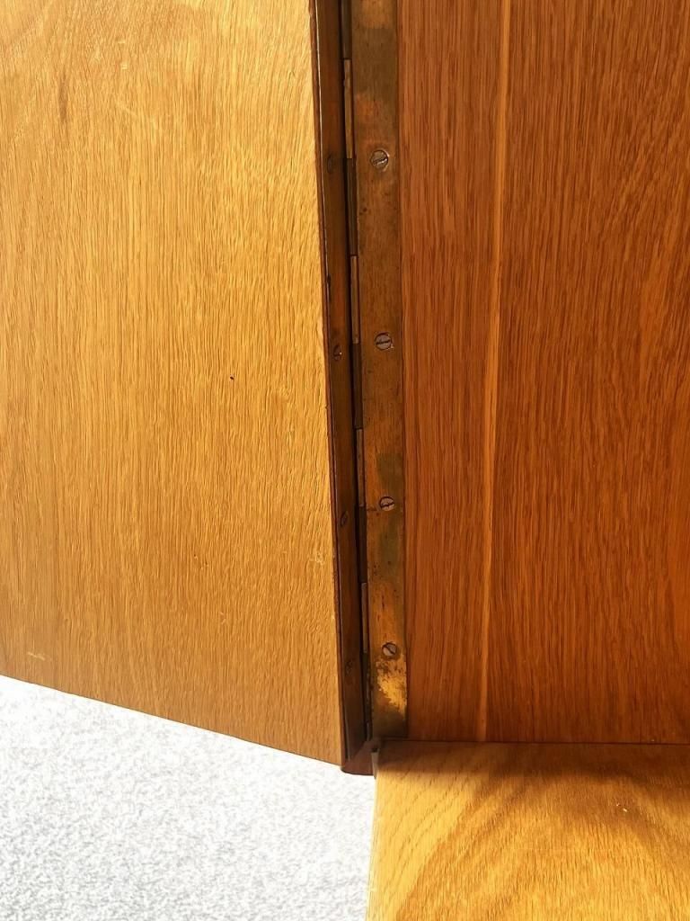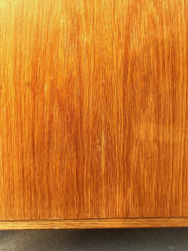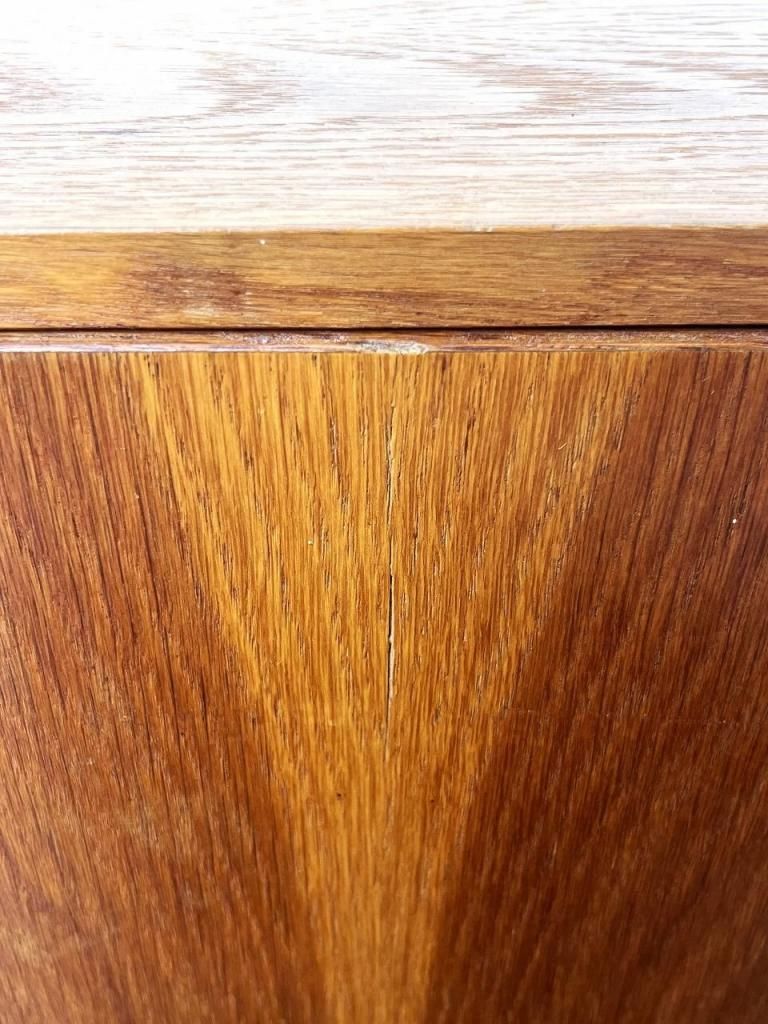 前面にはオーク材の美しい杢目を左右対称に張り合わせたブックマッチ貼りが施され、シンプルな直線デザインの中に自然のリズムが映えています。