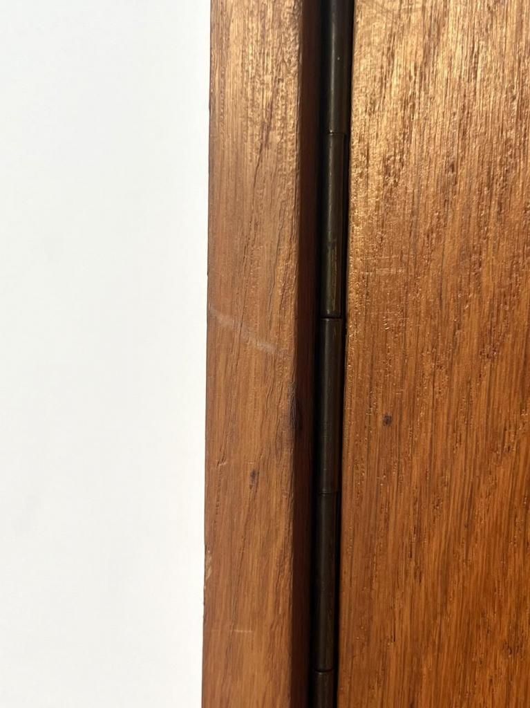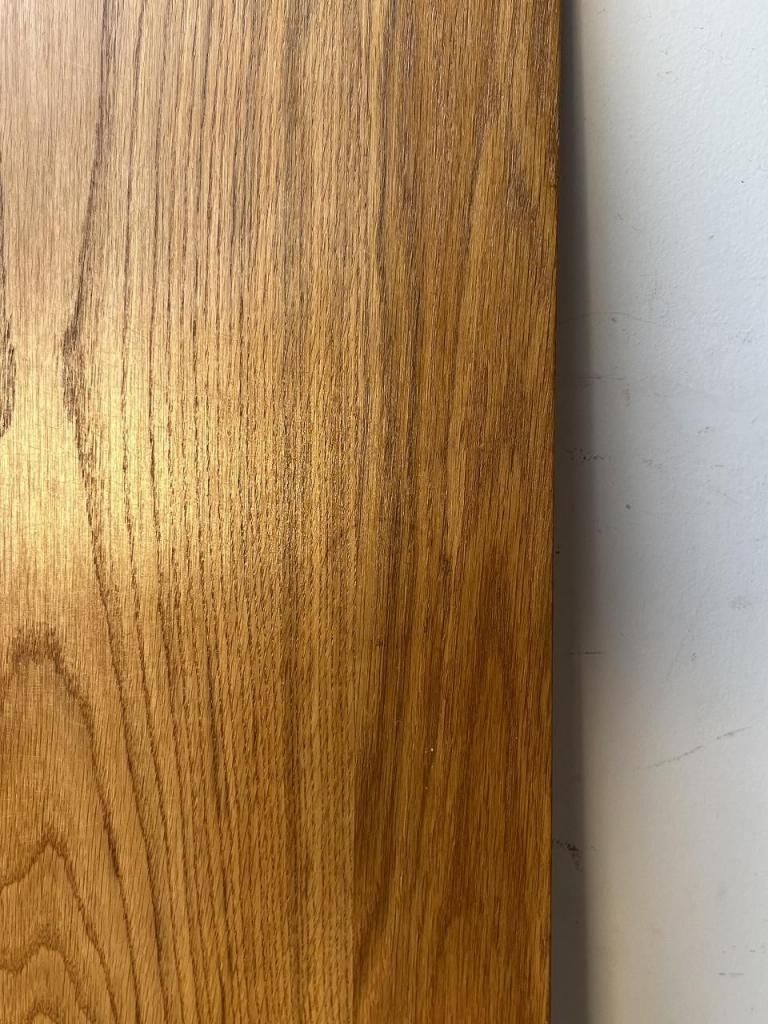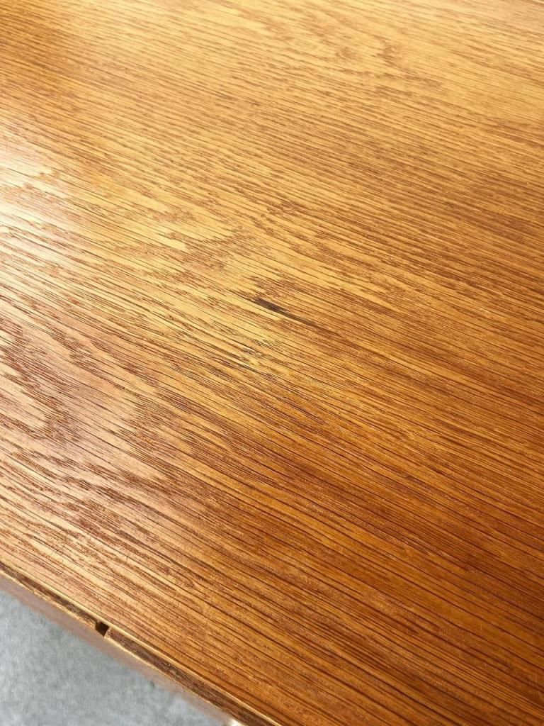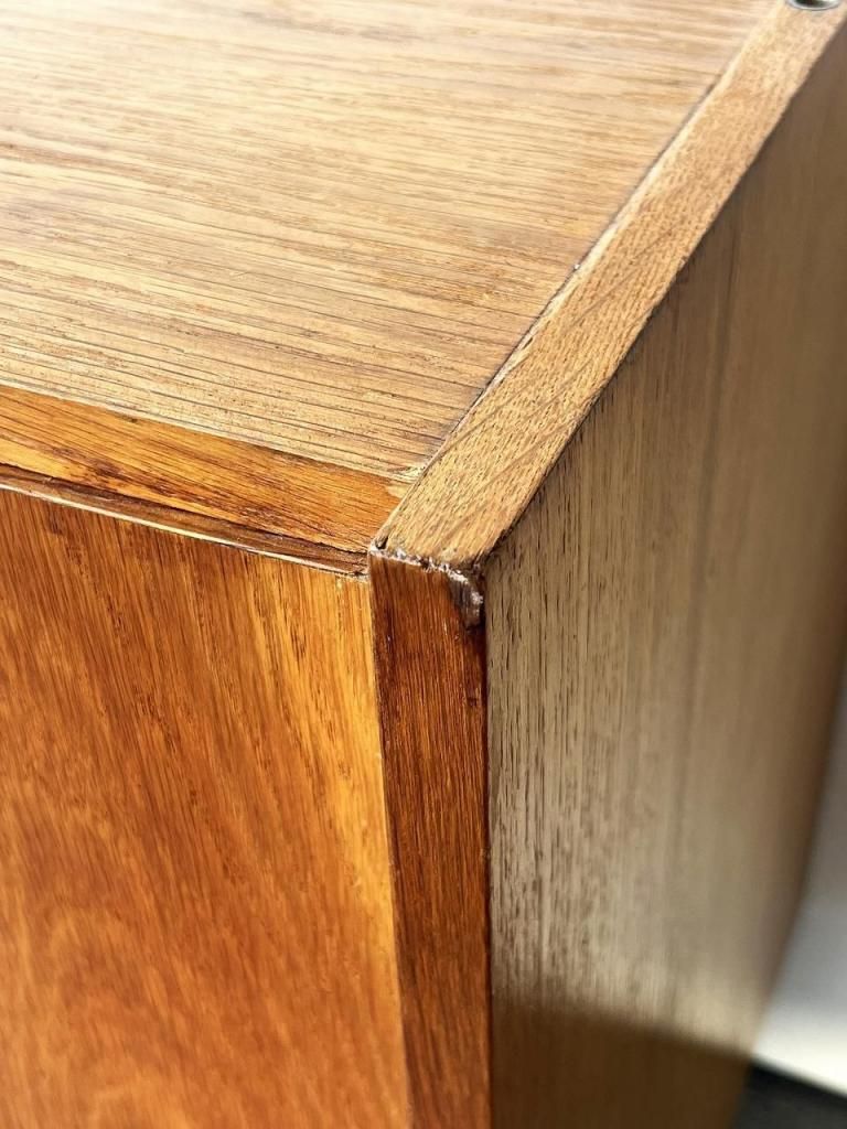 前面にはオーク材の美しい杢目を左右対称に張り合わせたブックマッチ貼りが施され、シンプルな直線デザインの中に自然のリズムが映えています。