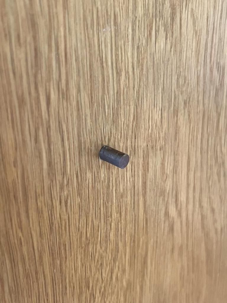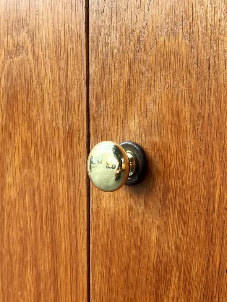 脚部は細身のテーパードレッグ、そして中央の真鍮ノブがミニマルなアクセントとして全体を引き締めています。