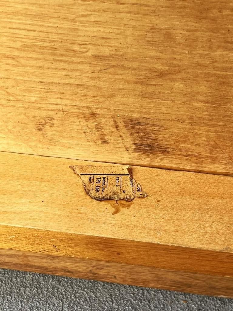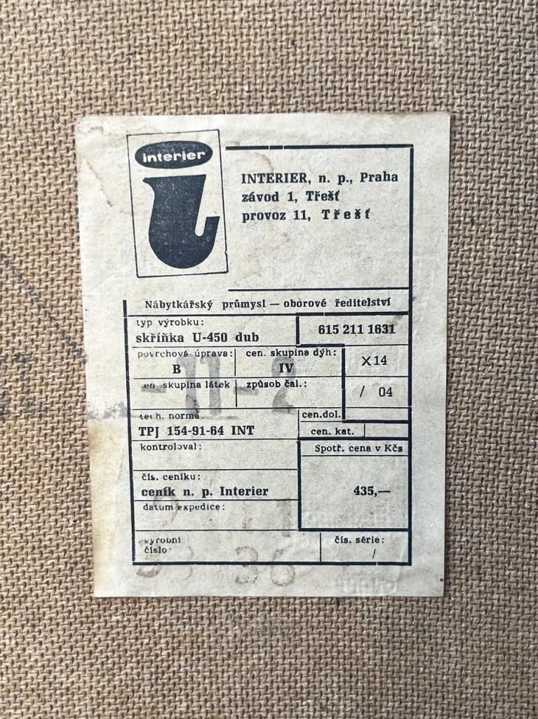 背面のラベルには「Interier n.p. Praha, závod 1, Třešť」の表記が確認でき、オリジナル当時の出荷ラベルが良好に残っています。