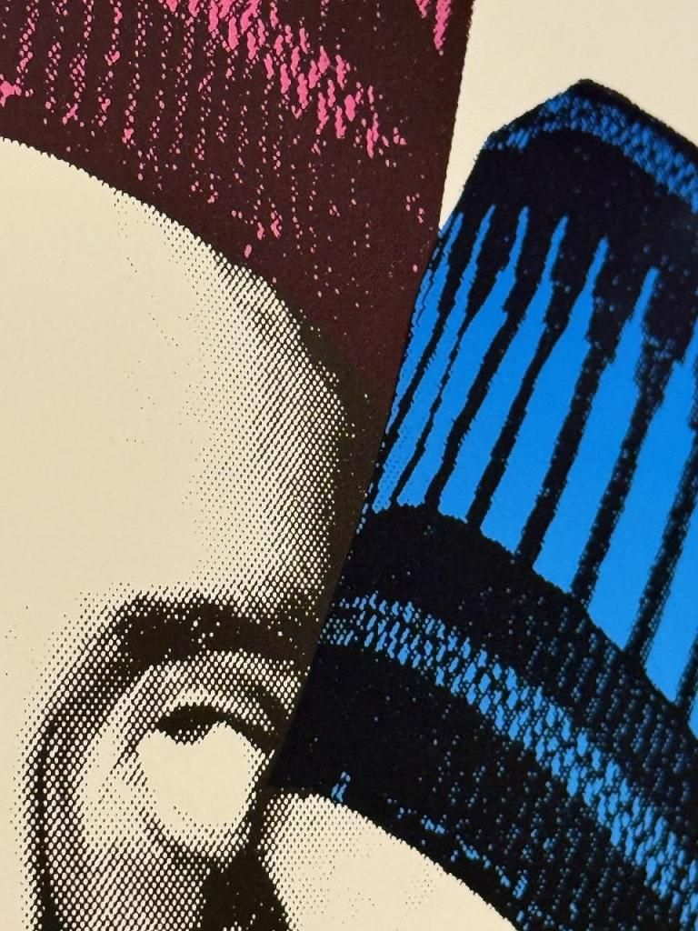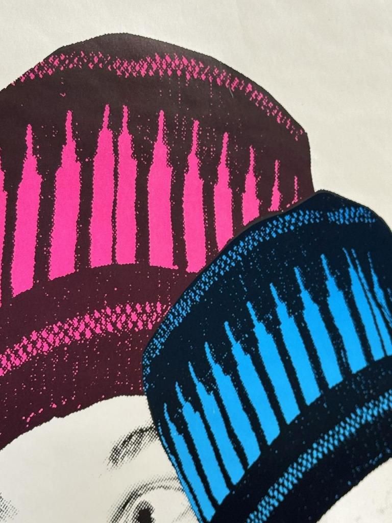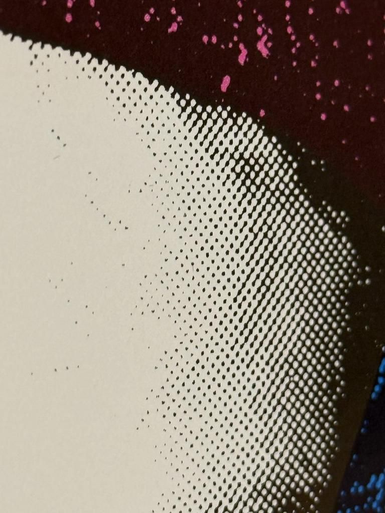 オフセット印刷と呼ばれる技法でプリントされており、拡大すると細かいドット(網点)が綺麗に表現されています。色の境界がはっきりしていることから技術のあるプリントメーカーが製作したオリジナル作品であると考えられます。