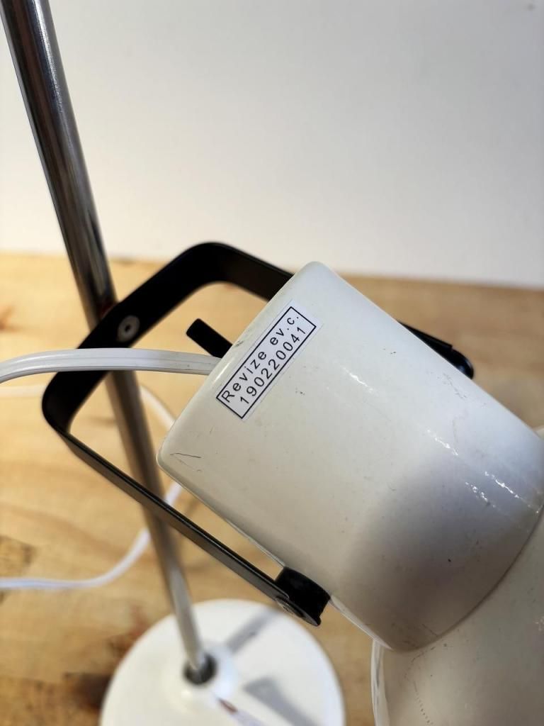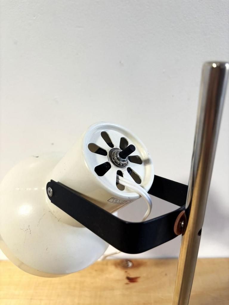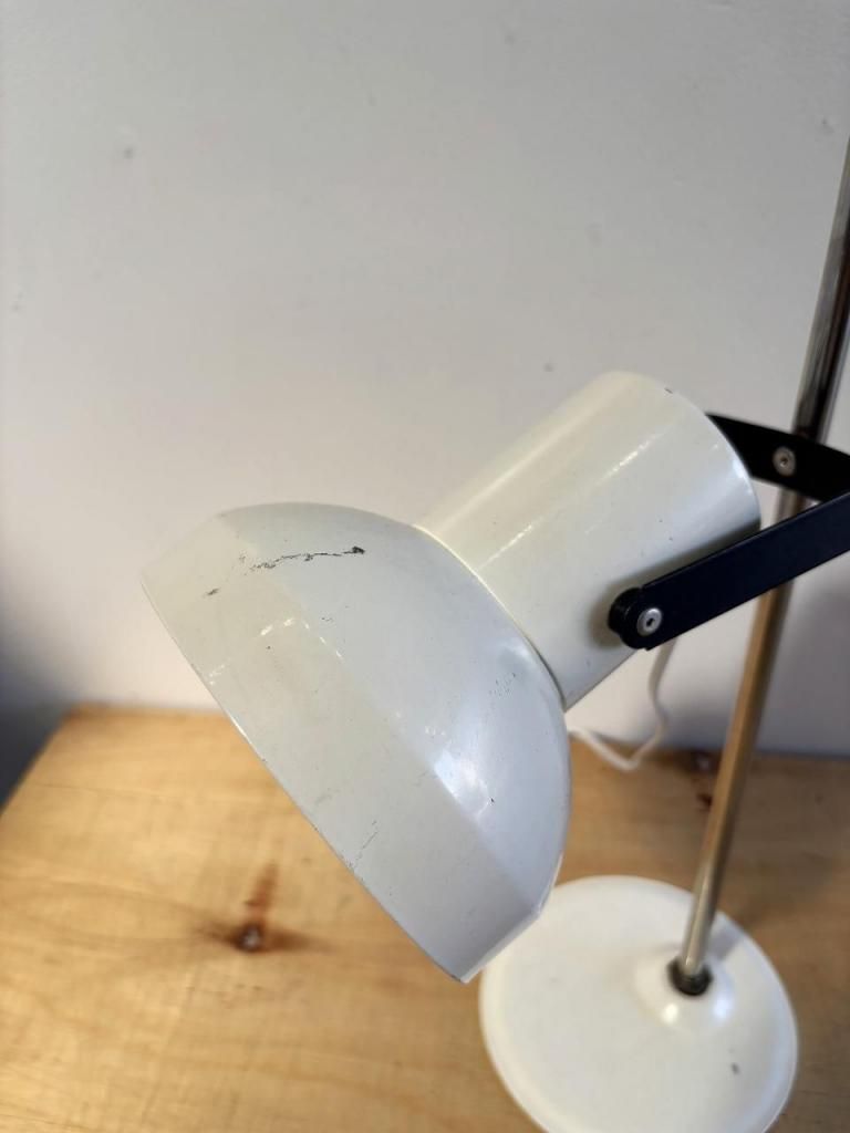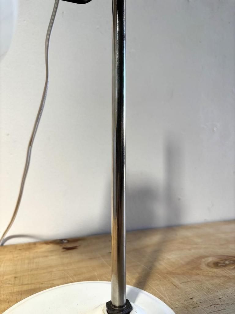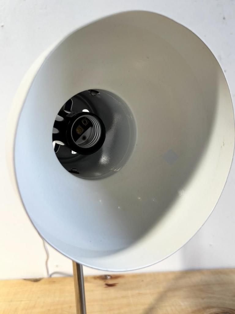 白のスチールシェードにクローム支柱、黒のアームパーツを組み合わせた、シンプルながらも東欧デザインらしい魅力のある一台。