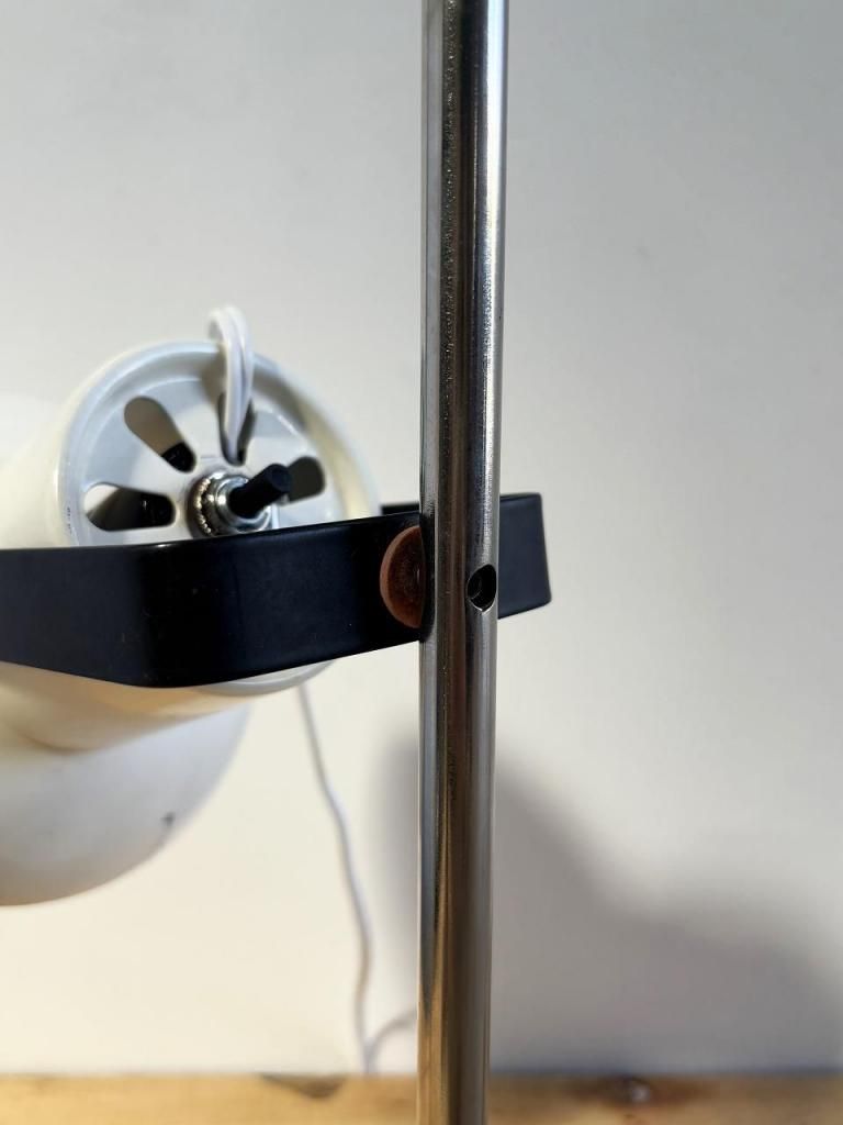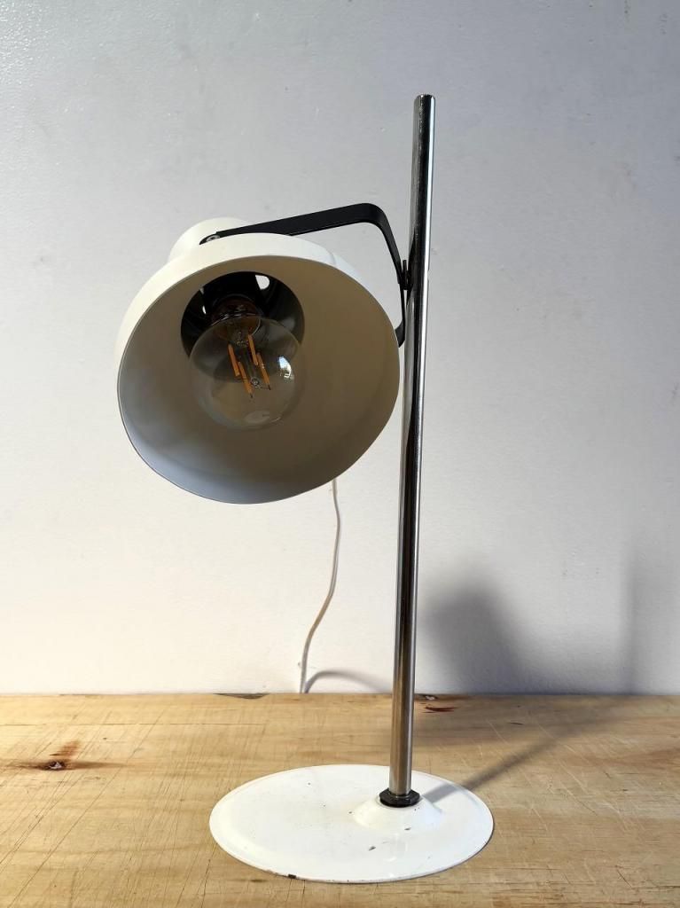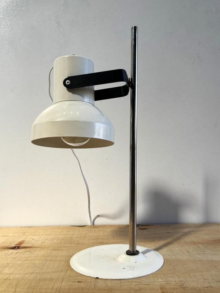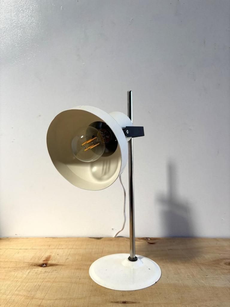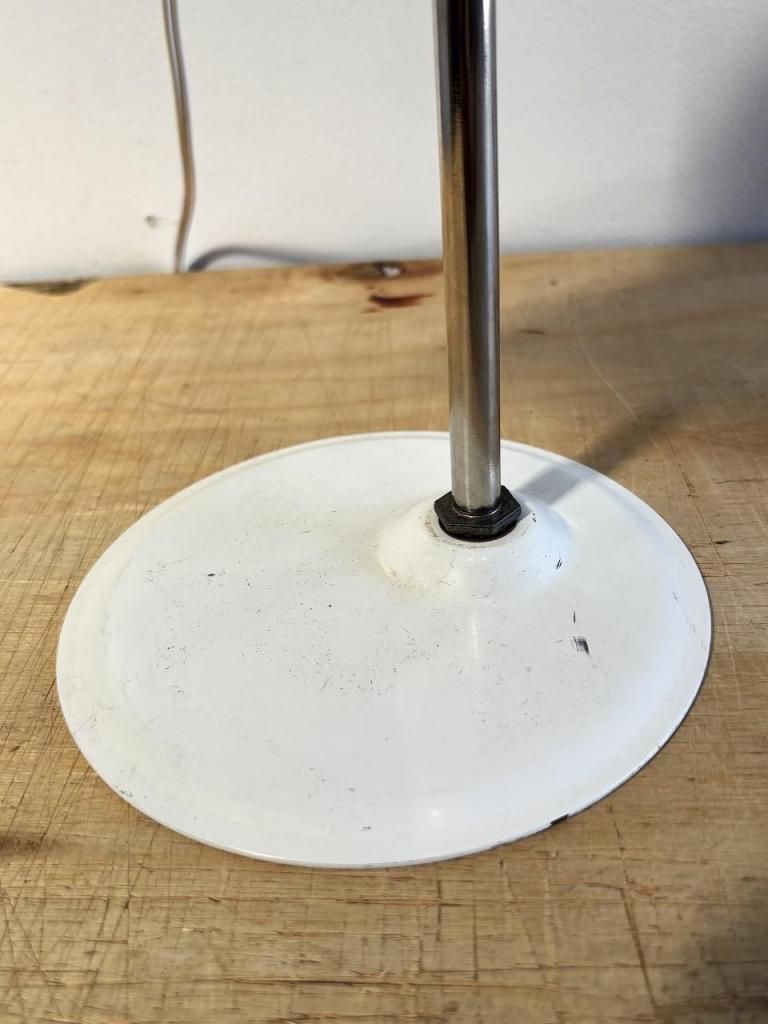 白のスチールシェードにクローム支柱、黒のアームパーツを組み合わせた、シンプルながらも東欧デザインらしい魅力のある一台。