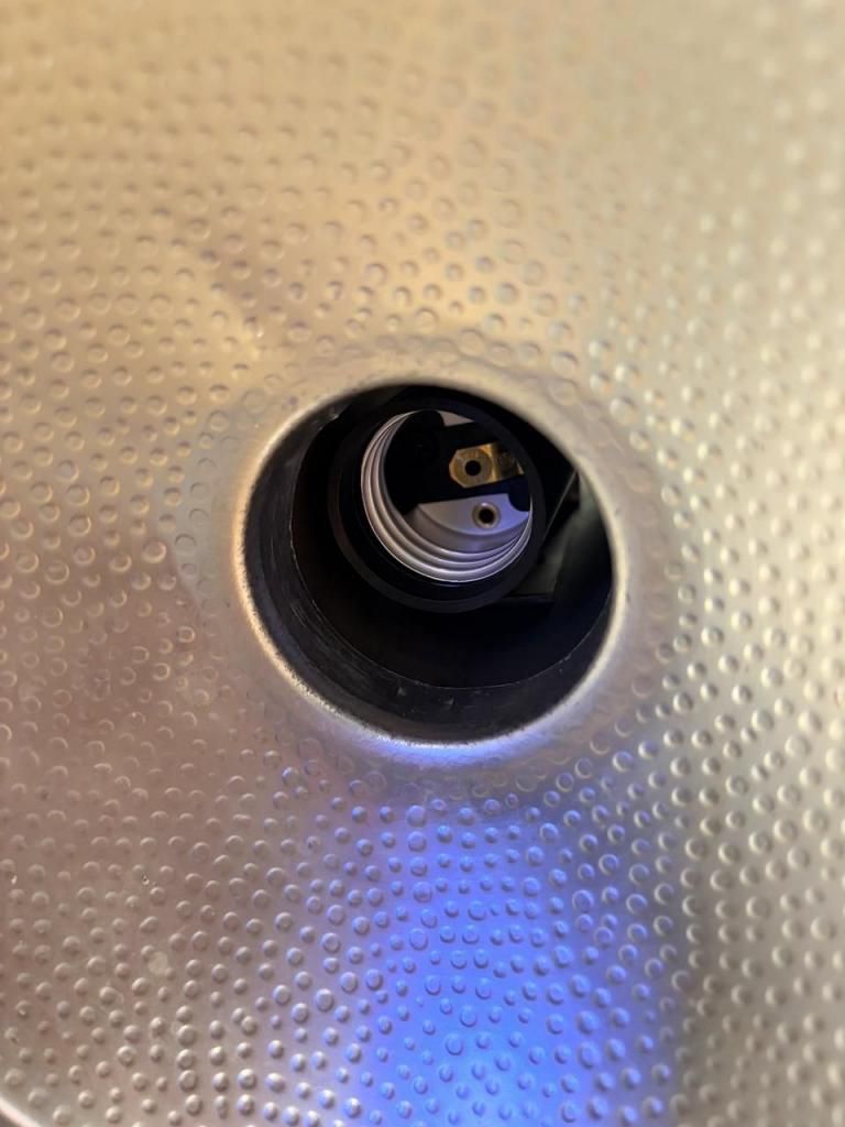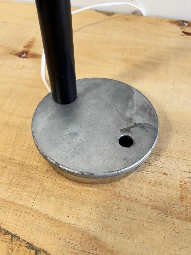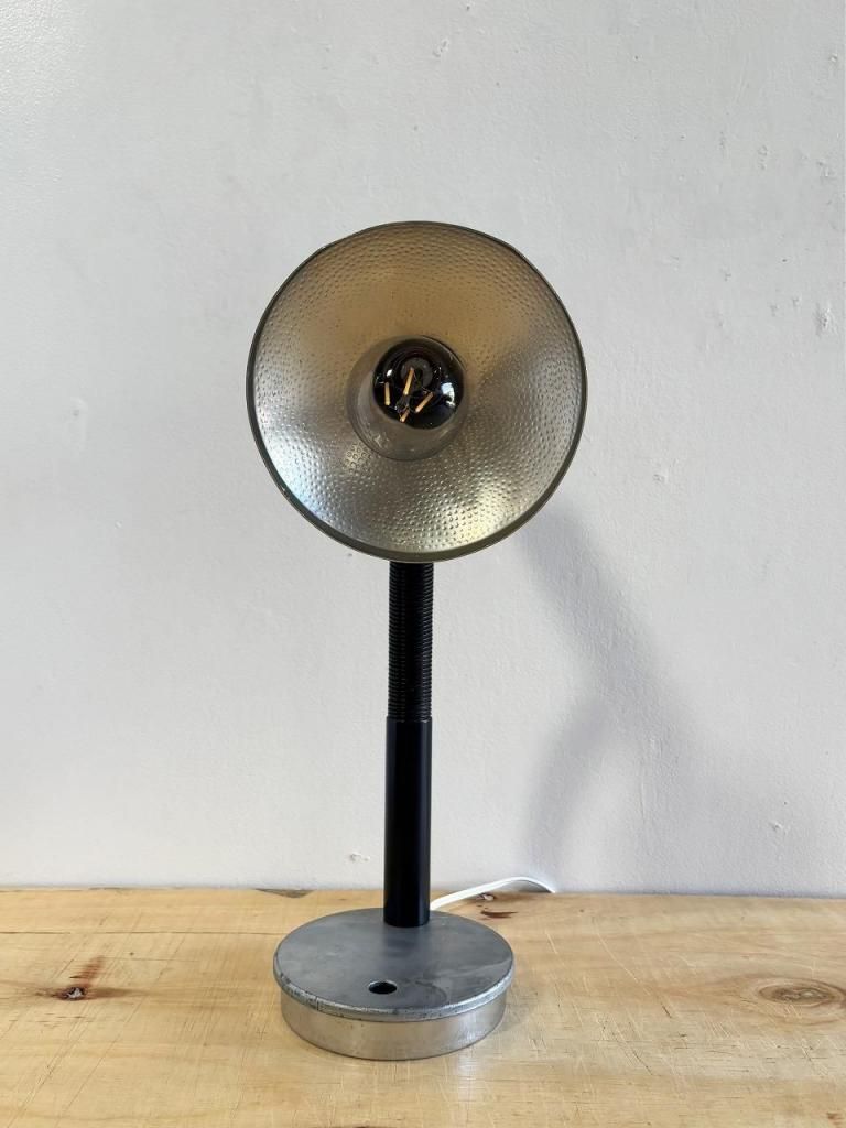 円筒形のシェードとリフレクターガラスによる構成は、当時の工業照明や作業灯に見られる機能的な造形です。