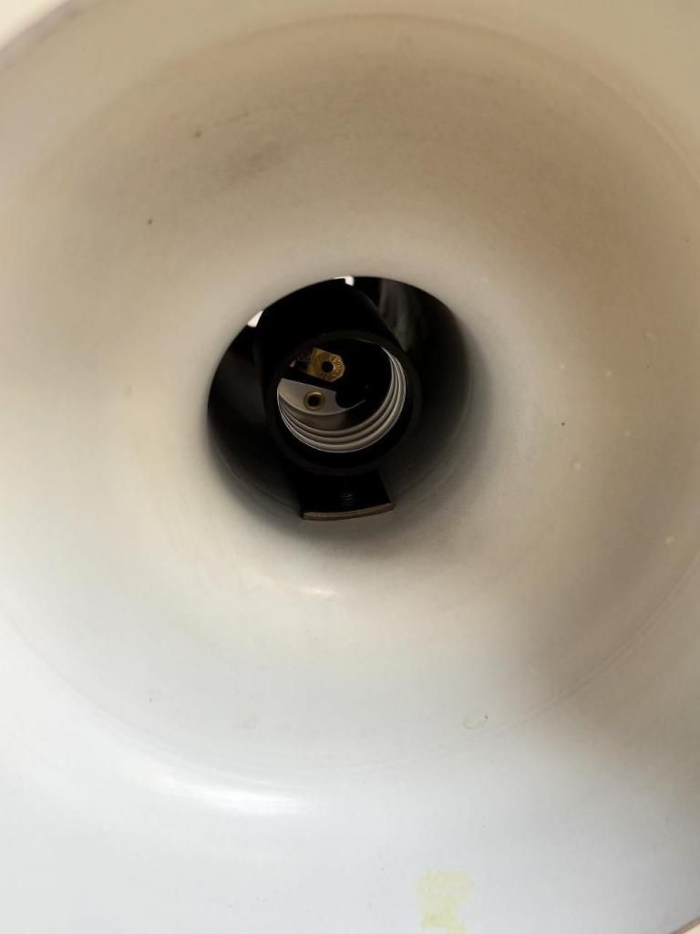 シェード背面の放熱孔や、柔軟に動くグースネック構造など、当時の工業製品としての実用性と造形美を併せ持ったデザインです。