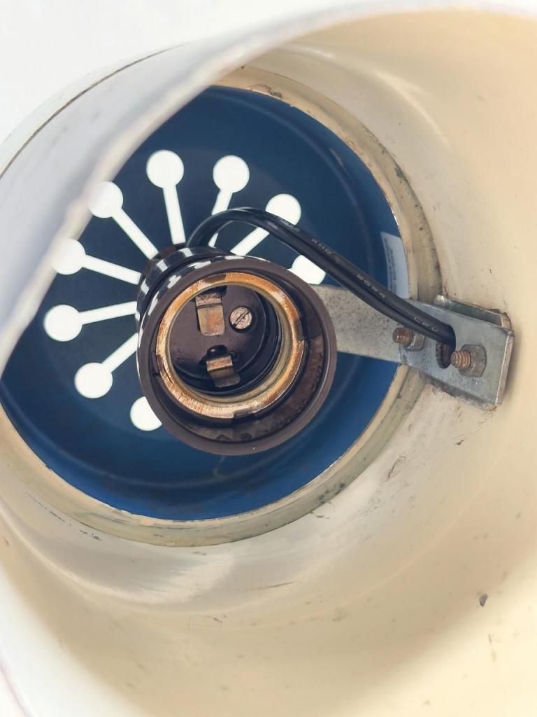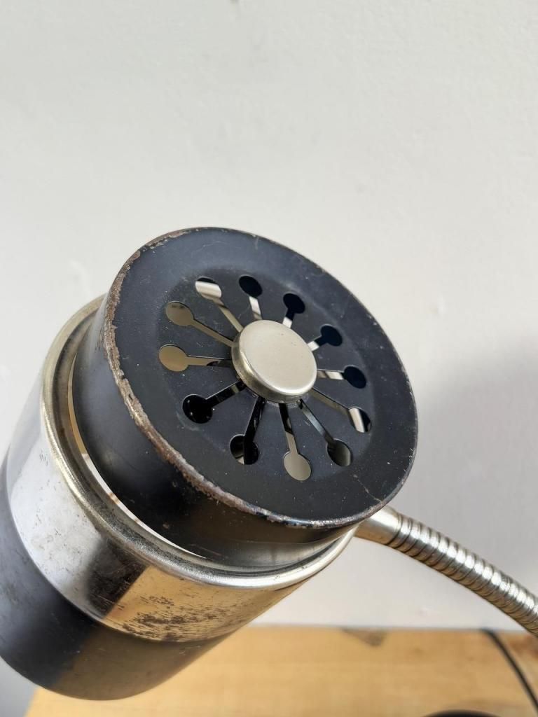 筒状のシェードフォルムは当時のワークライトらしい無骨さを感じさせつつも、シェードトップに施された放熱孔のデザインやメタルの質感など、細部には工芸的な美しさも見られます。