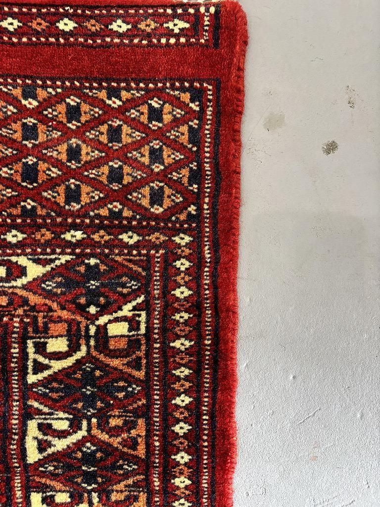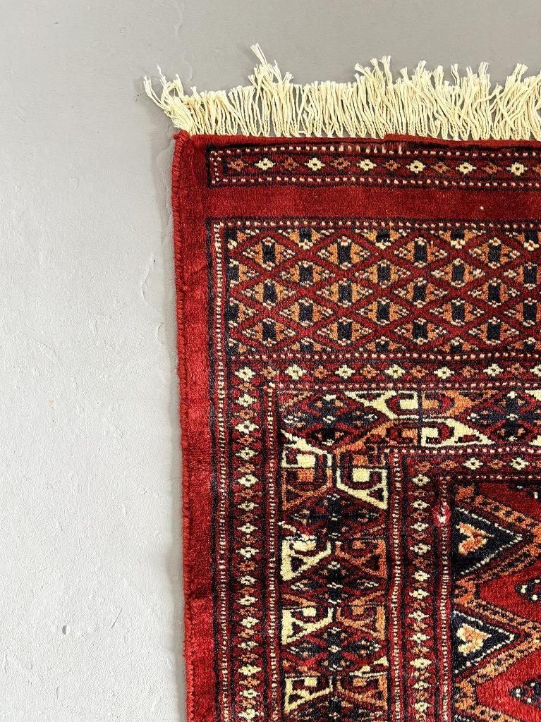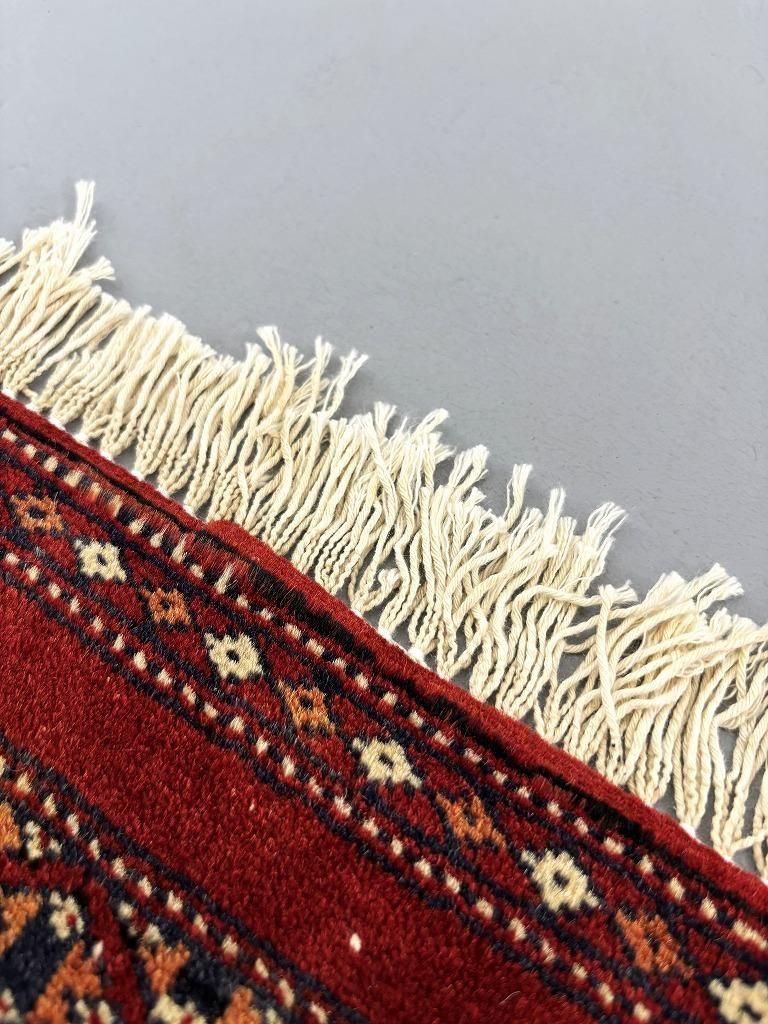 ハンドノット(手結び)により一枚一枚つくられており、赤をベースに、中央に菱形の幾何学模様が縦に並ぶ1枚。