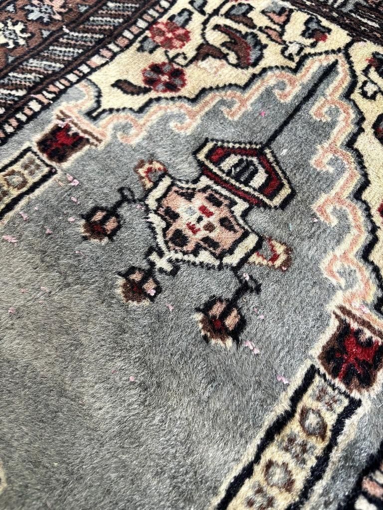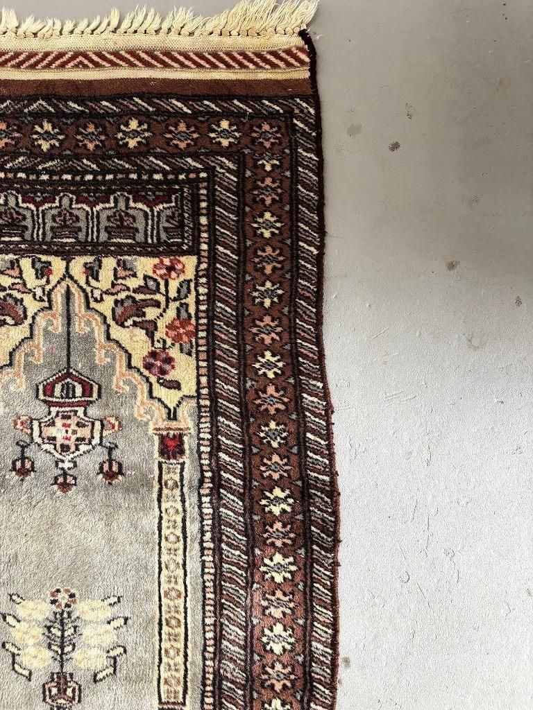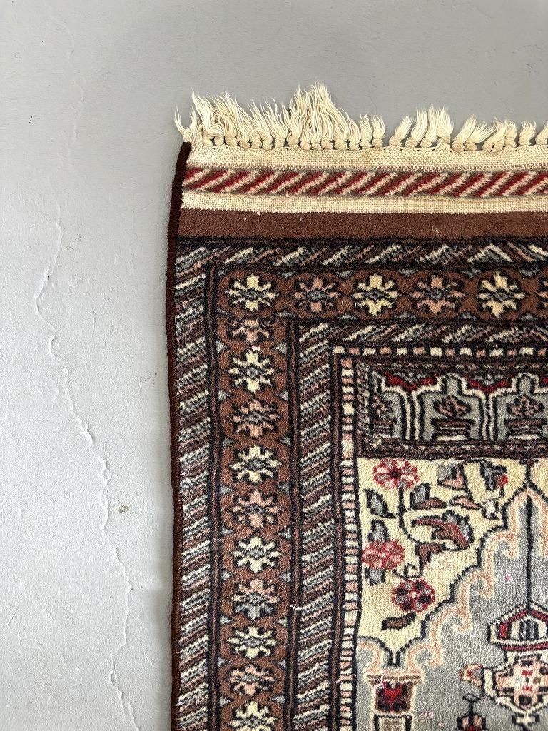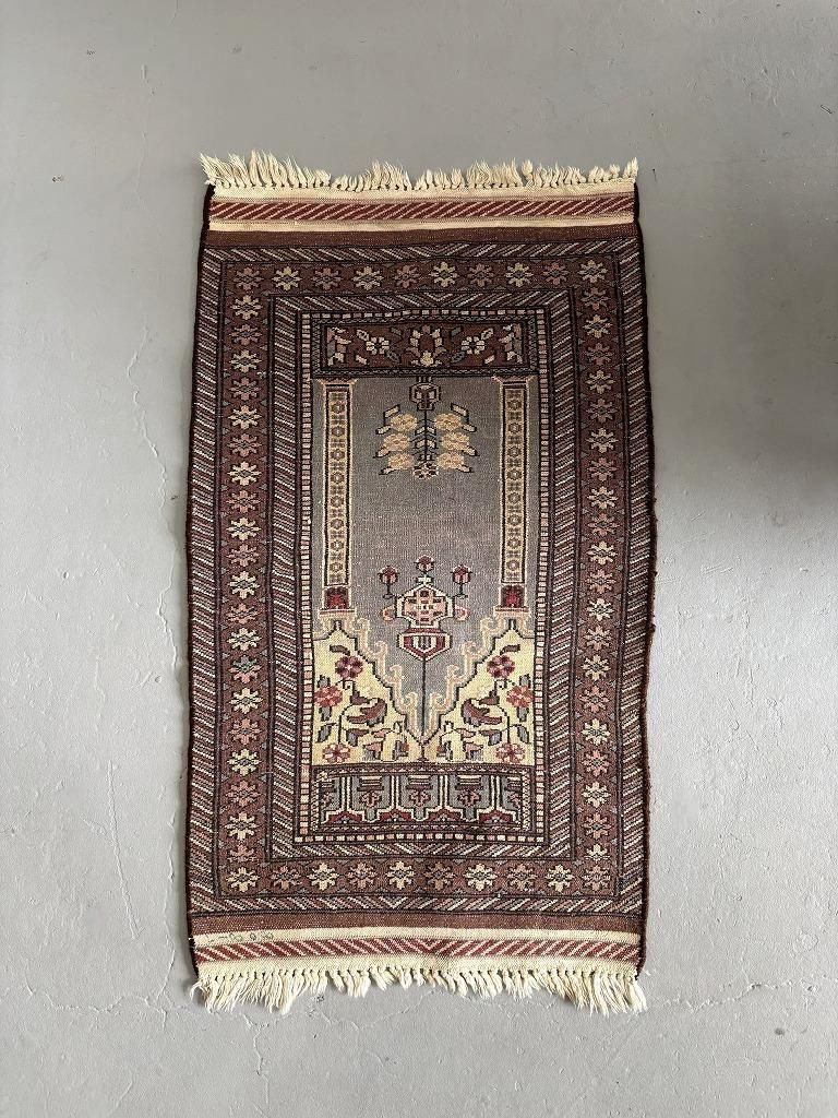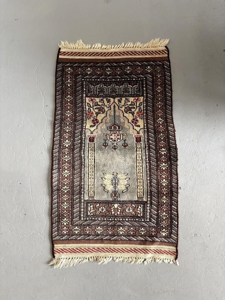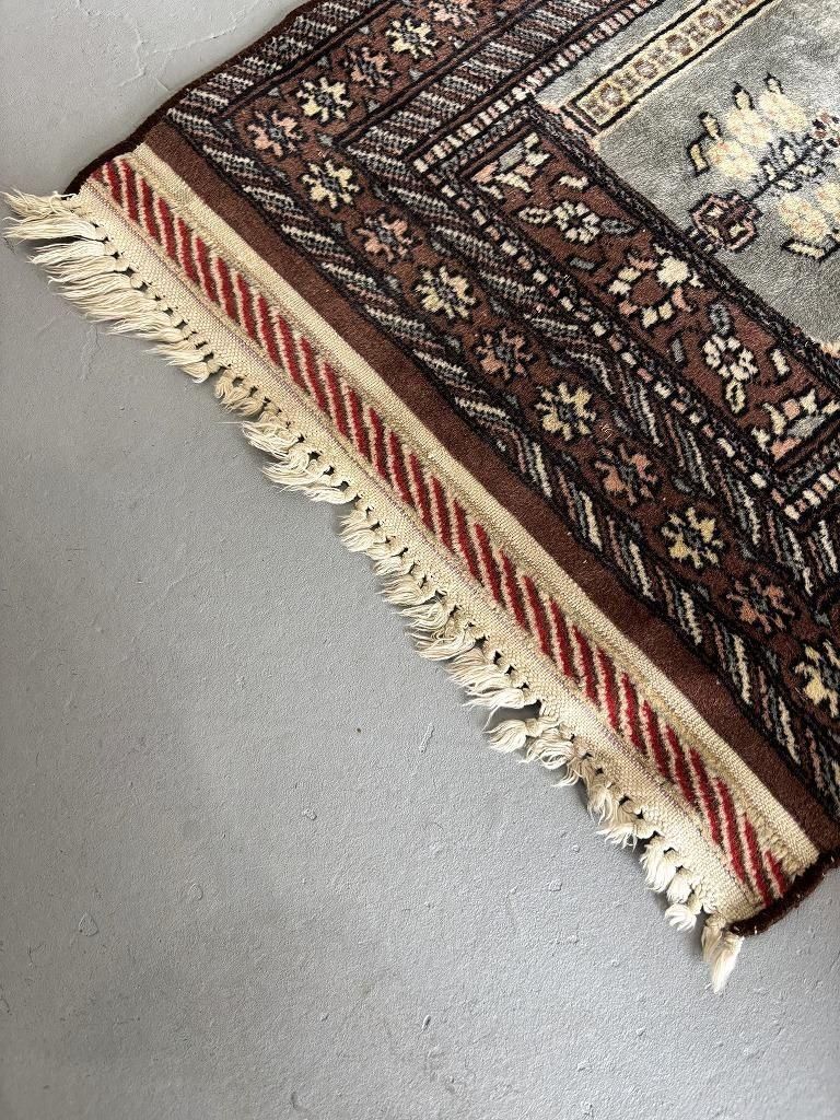 ハンドノット(手結び)により一枚一枚つくられており、茶色をベースに、上部にアーチ状のミフラーブ形が見られ、中央に祈りの場を思わせる空間がデザインとして形成された1枚。