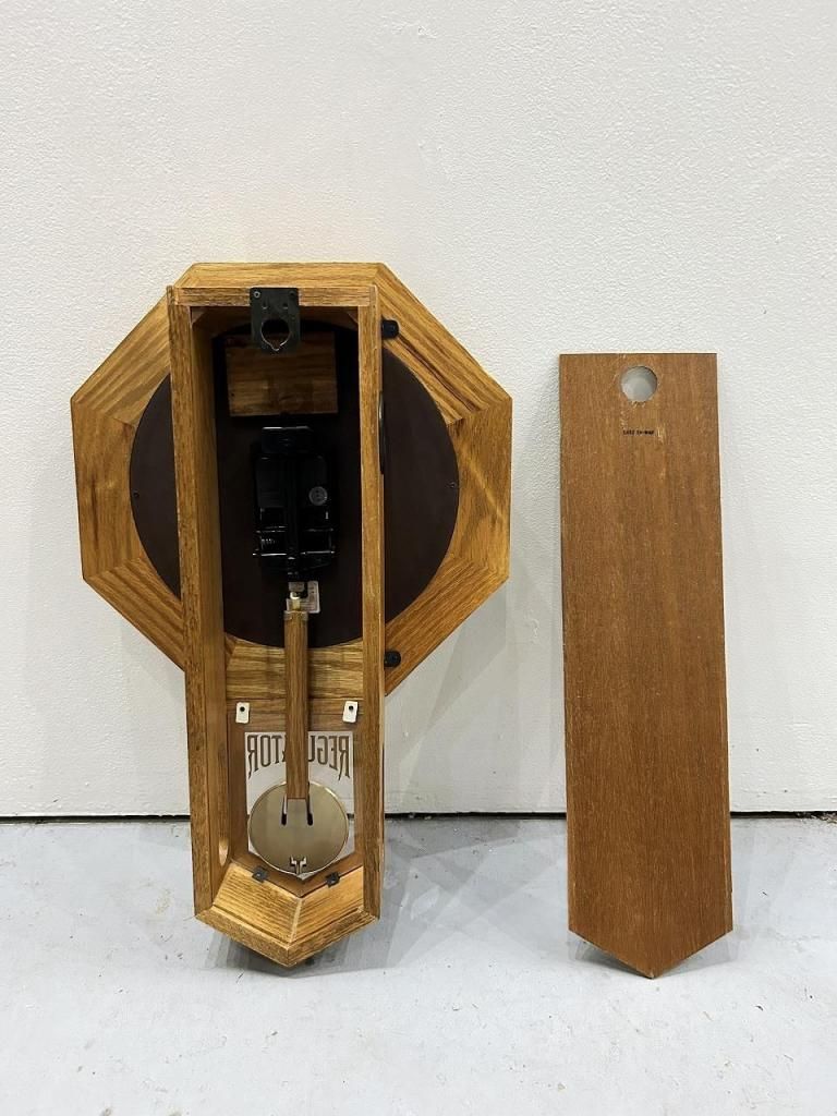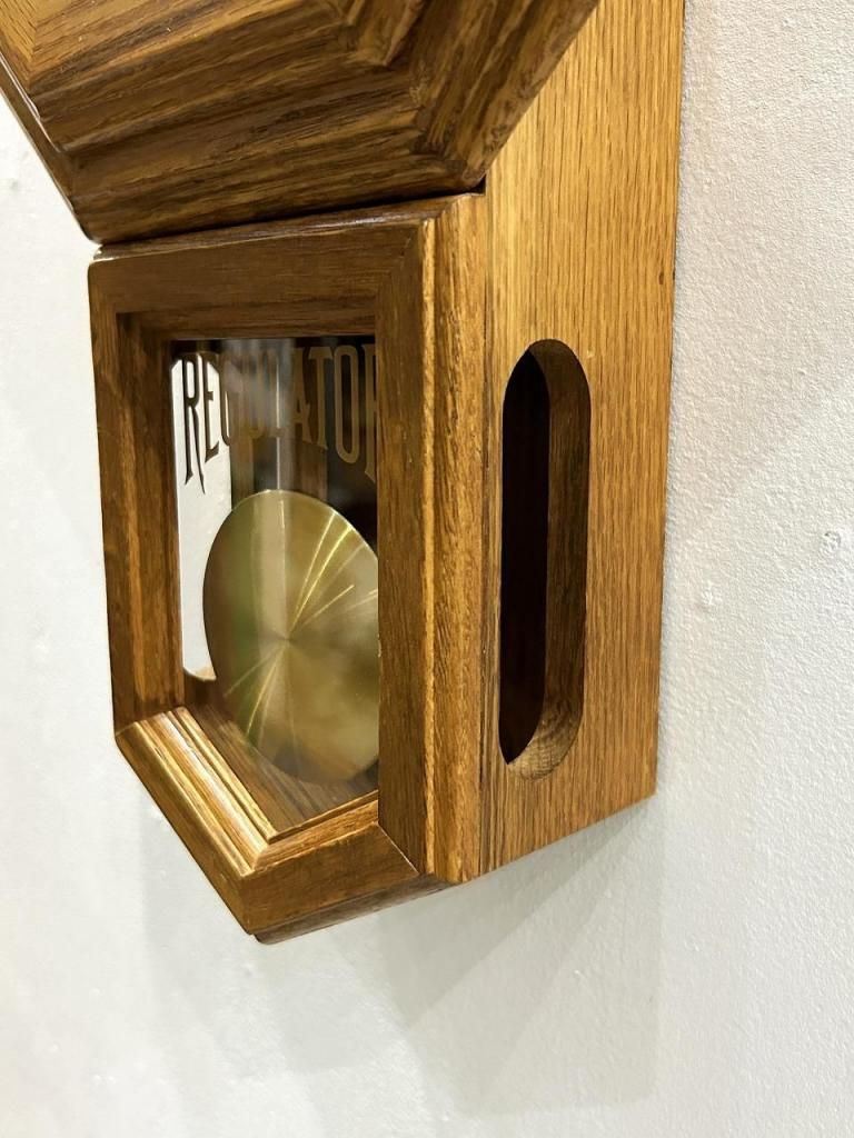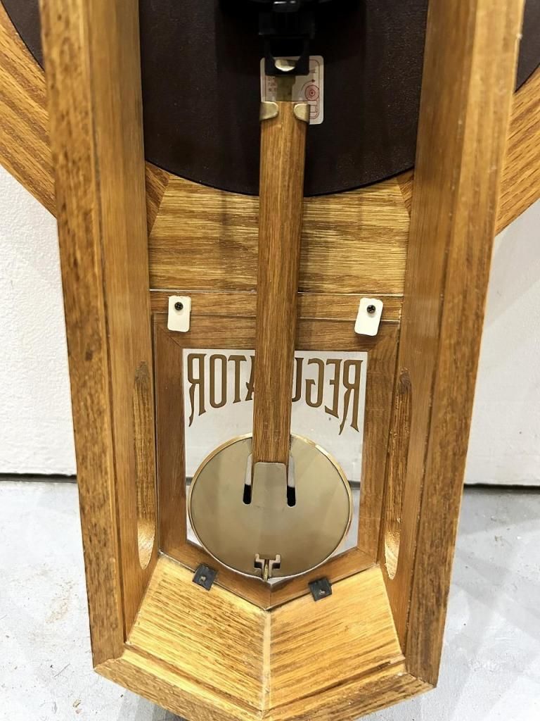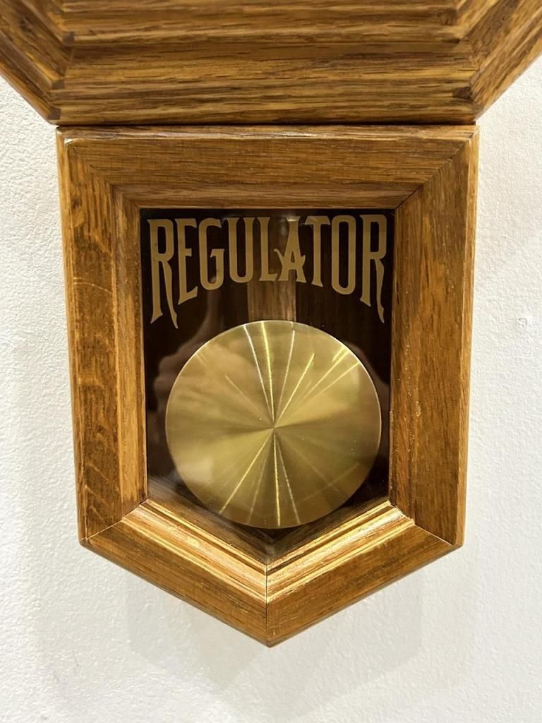 “REGULATOR(レギュレーター)” スタイルのクォーツ掛時計で、前面に“REGULATOR” ロゴが入り、アンティークスタイルを強調。