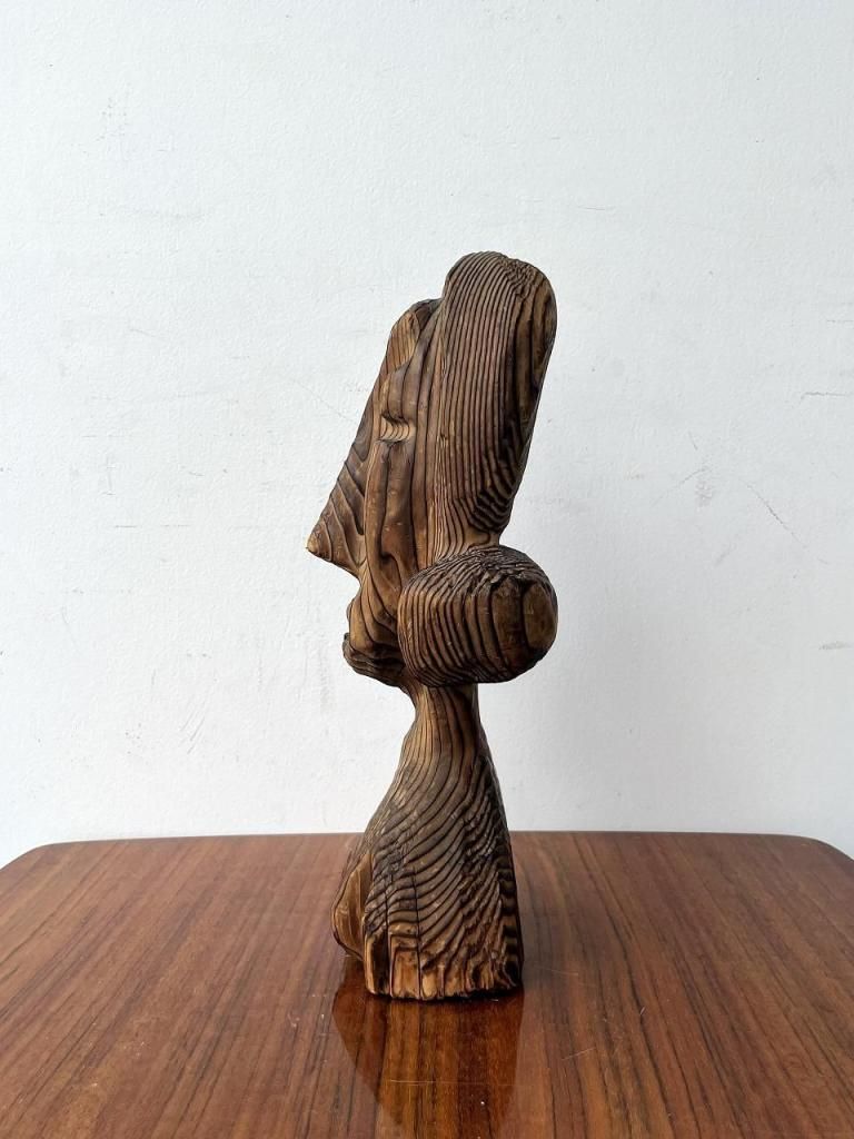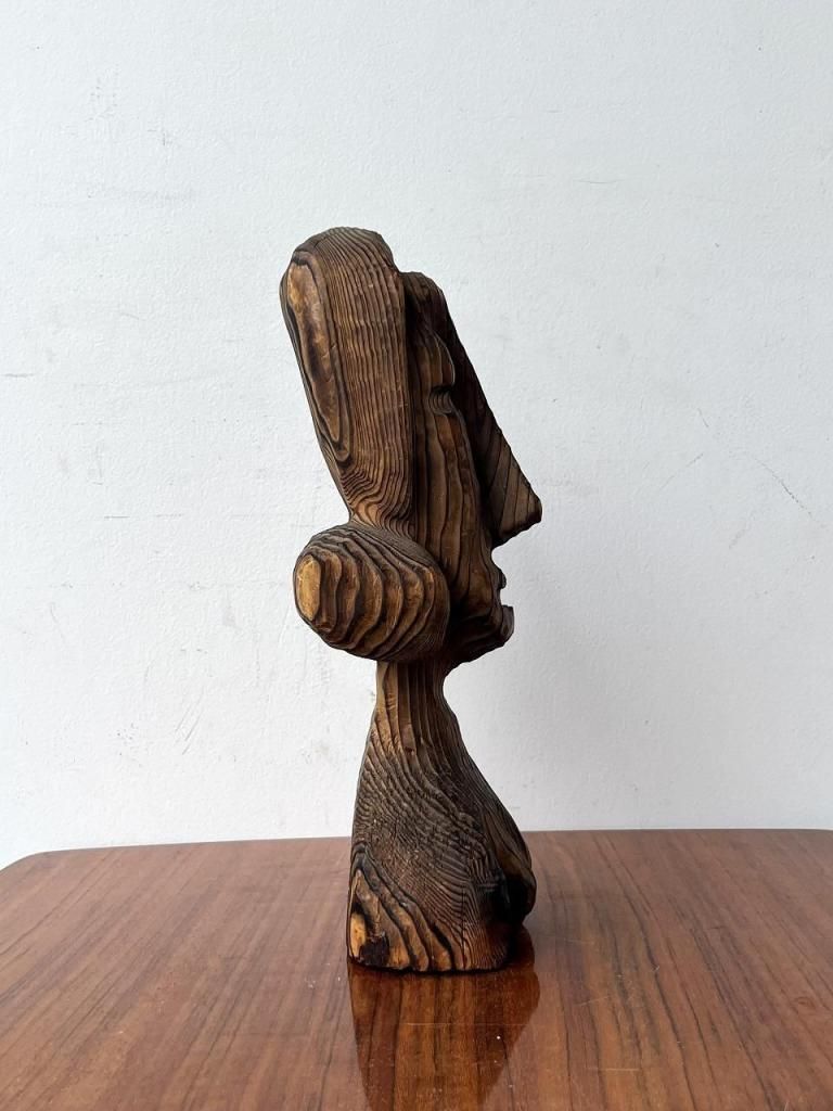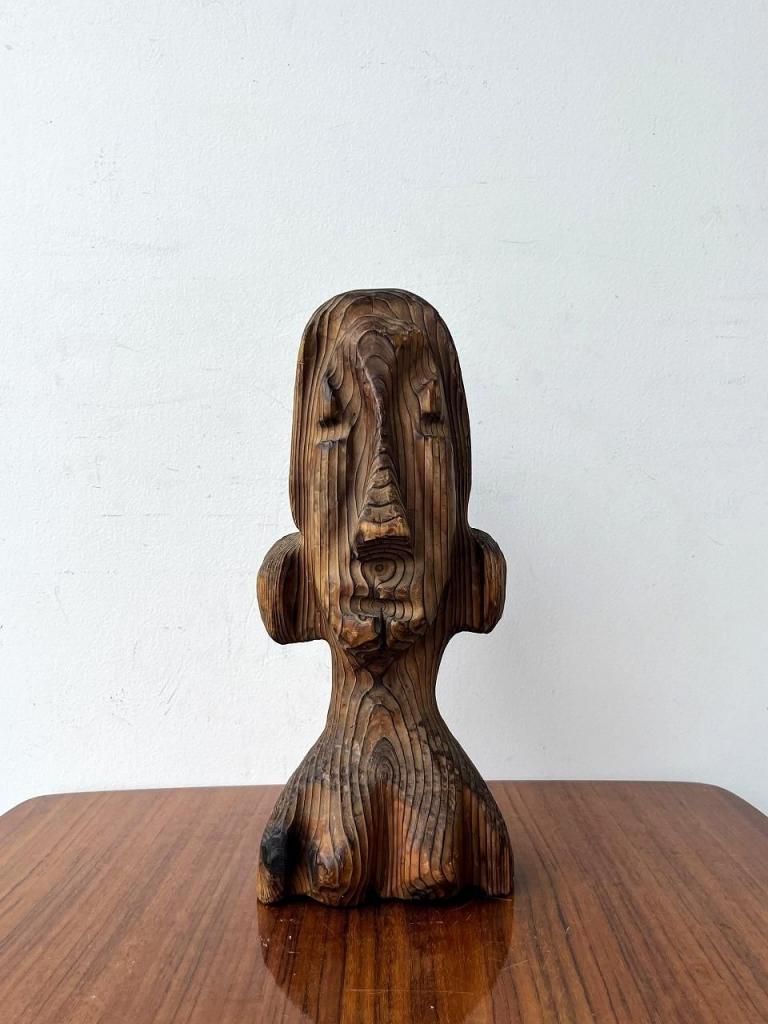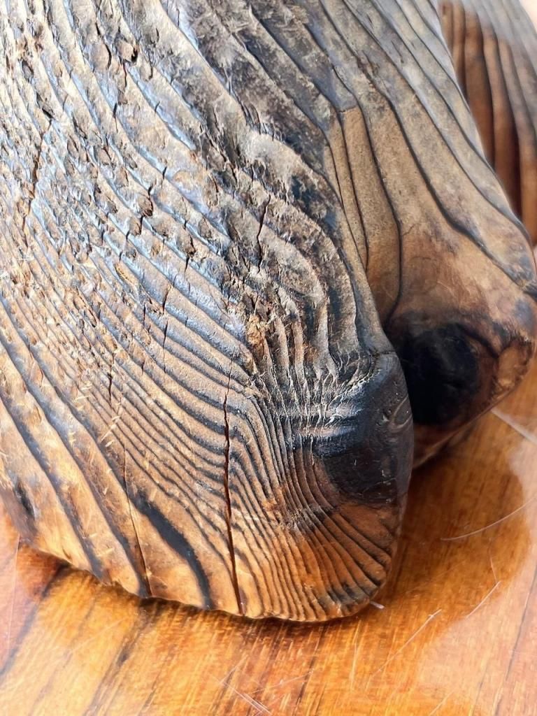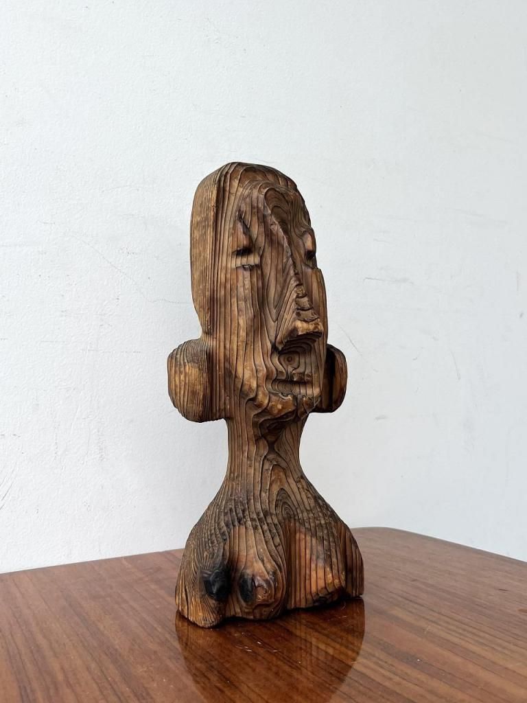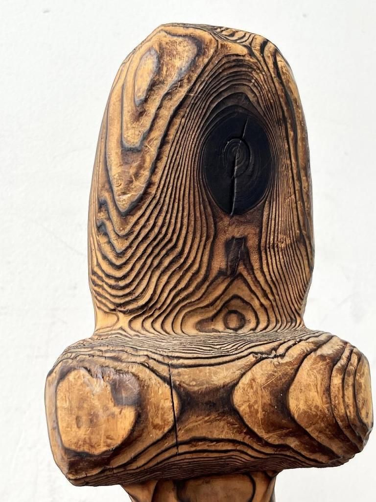 無垢材を使い焼き仕上げや粗い木肌がWITCOのような荒らしさを感じ、守護像・精霊像のような存在感がTikiバーなどで見られる守護神的彫刻と通じる部分があります。