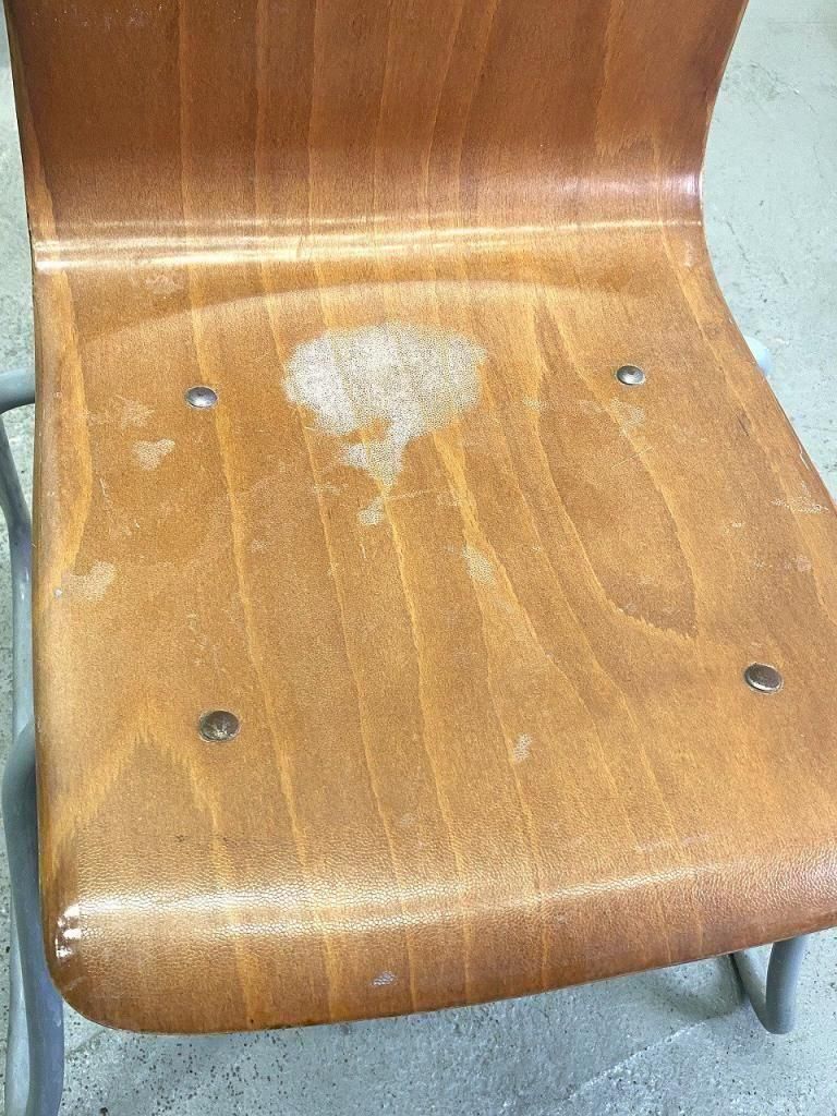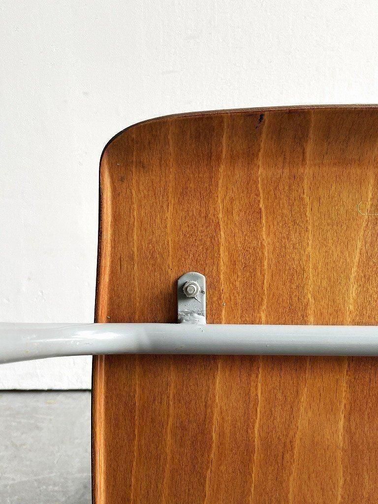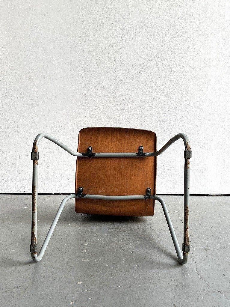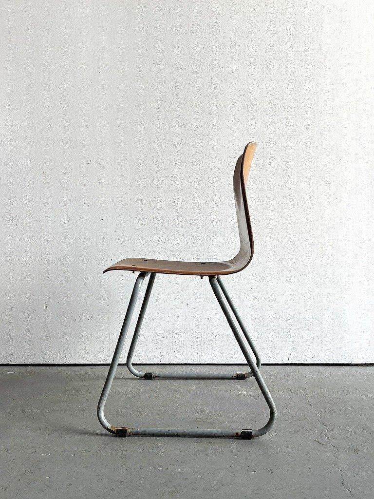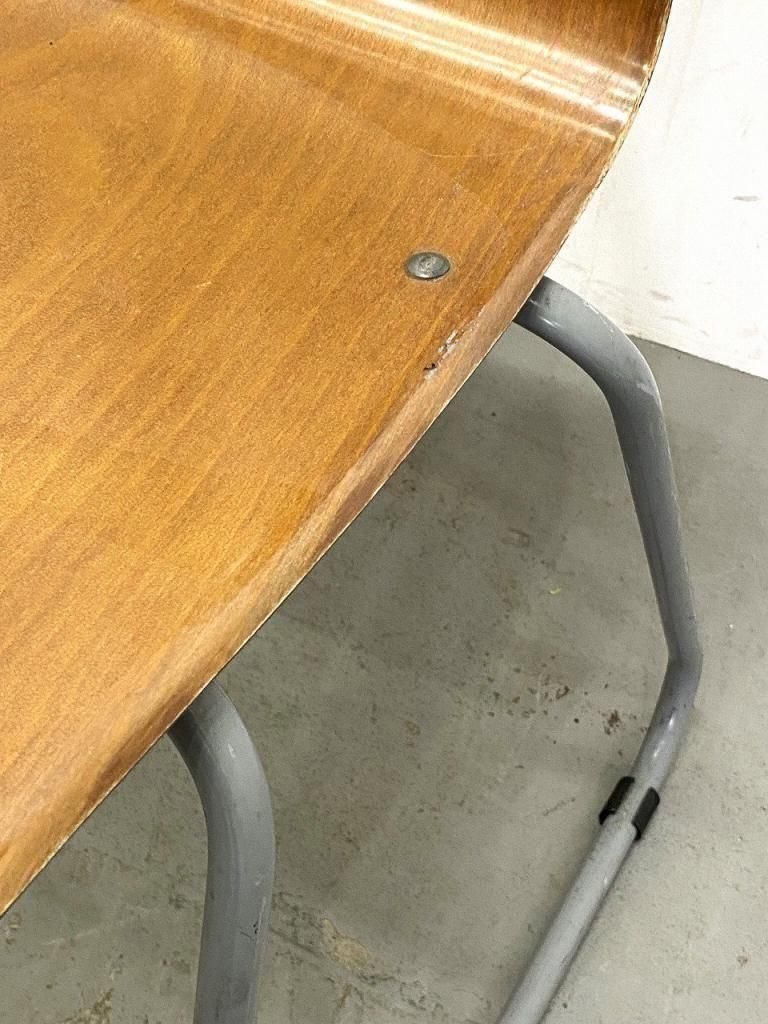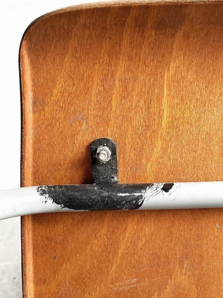背から座面にかけて緩やかにカーブしたフォルムは、当時の公共施設や学校などで多く見られたもので、座り心地と量産性を両立させたデザインです。