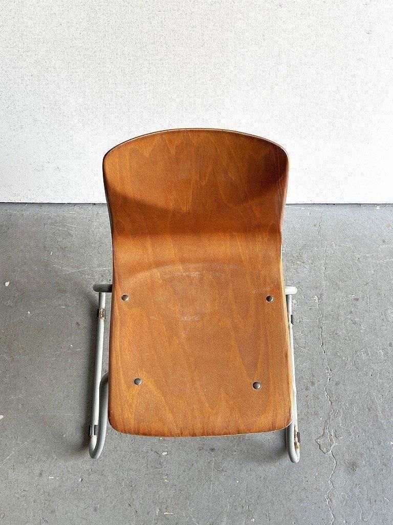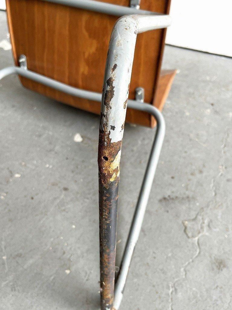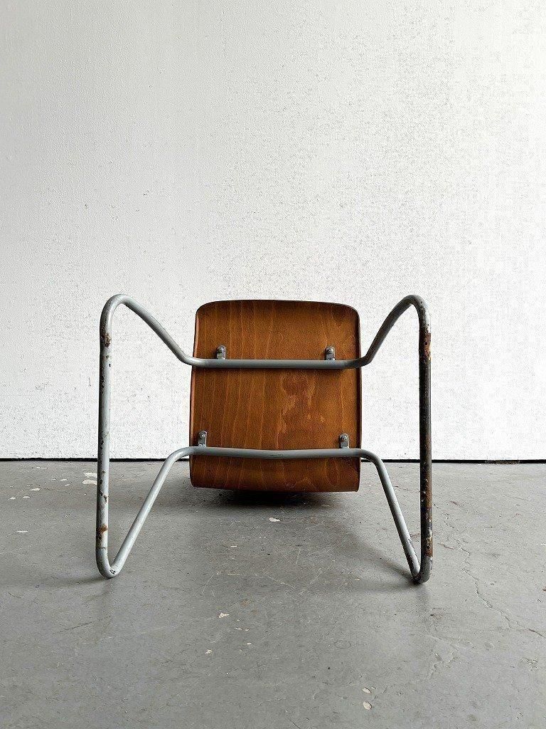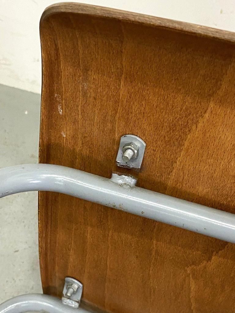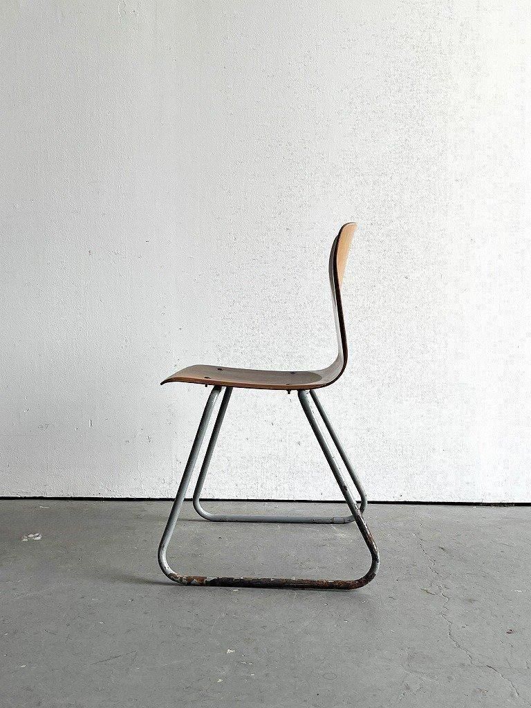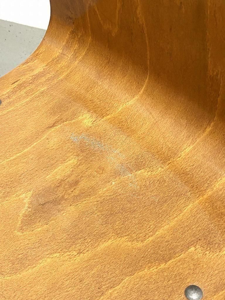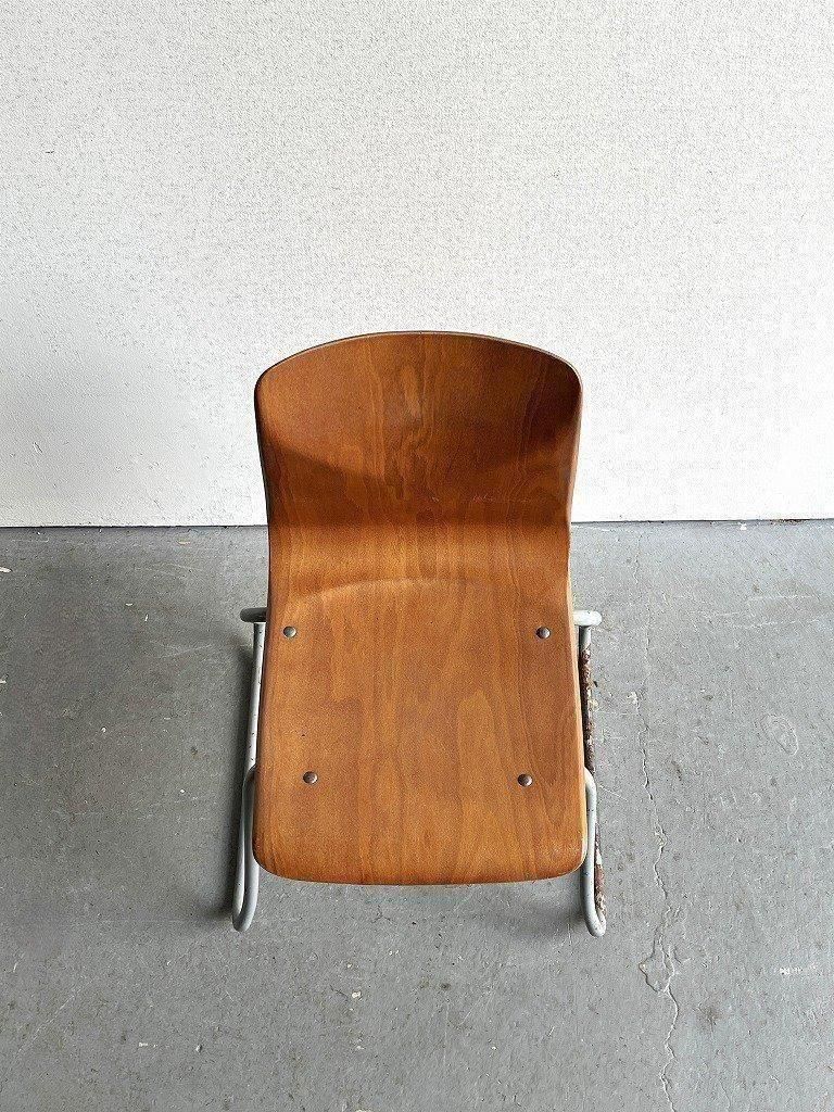 背から座面にかけて緩やかにカーブしたフォルムは、当時の公共施設や学校などで多く見られたもので、座り心地と量産性を両立させたデザインです。