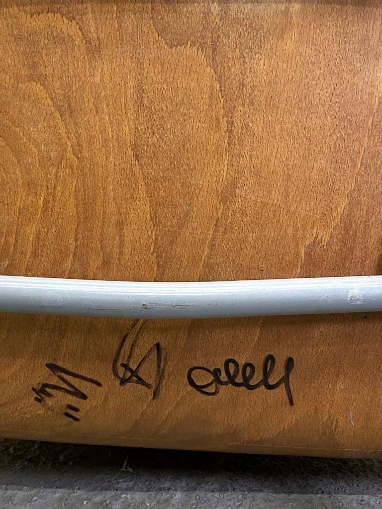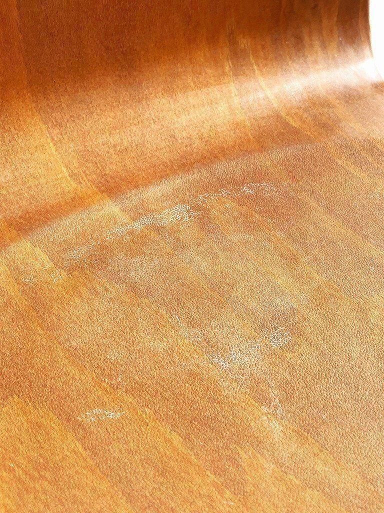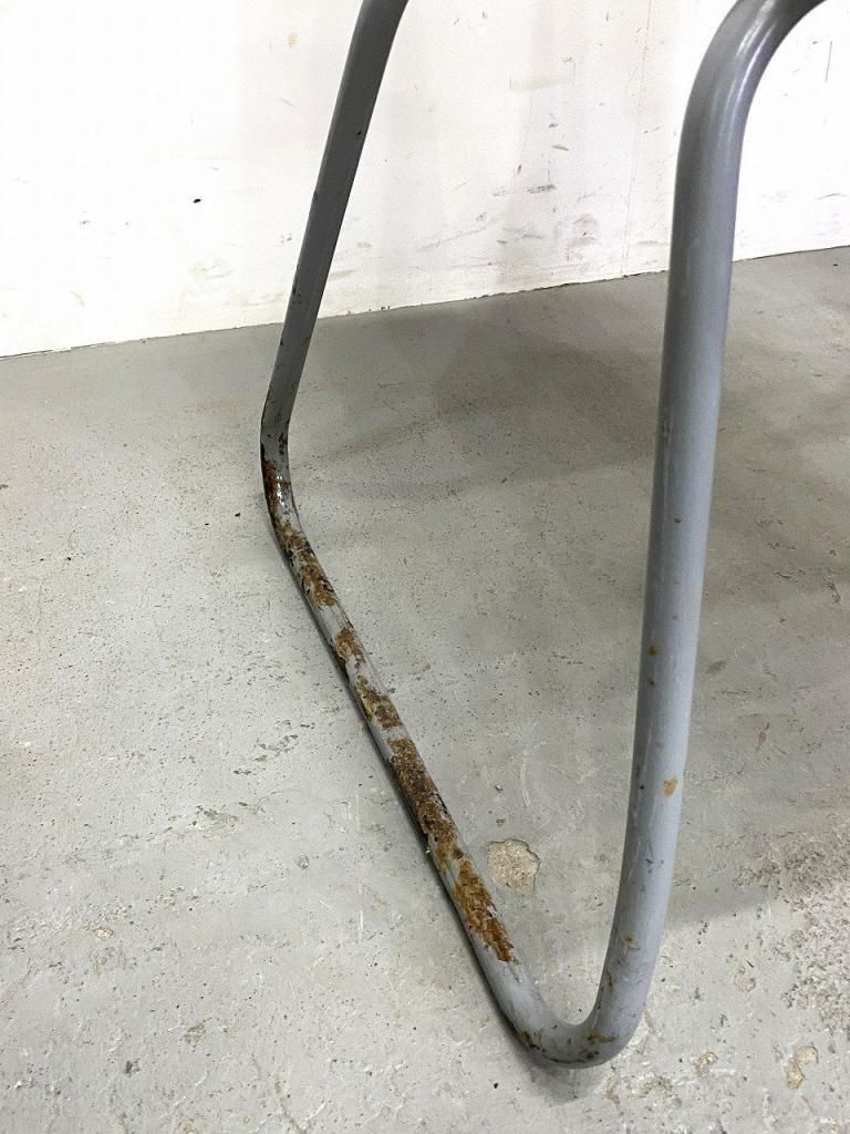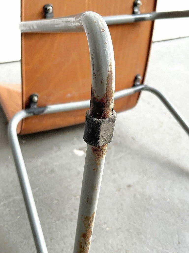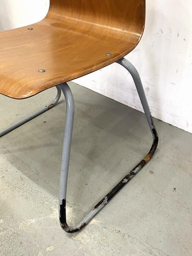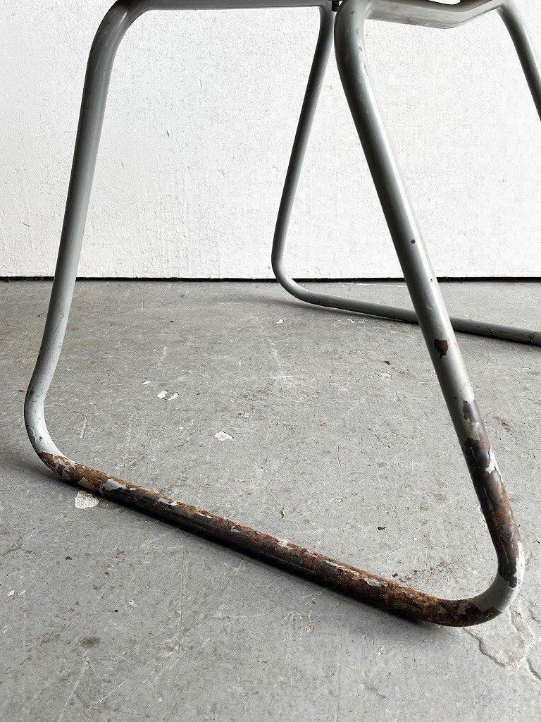 背から座面にかけて緩やかにカーブしたフォルムは、当時の公共施設や学校などで多く見られたもので、座り心地と量産性を両立させたデザインです。