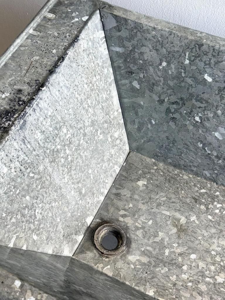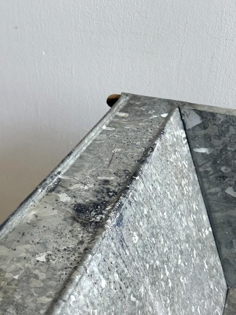 この特徴的な模様はスパングル模様という名前で、亜鉛メッキの冷却過程で結晶が花びら状に広がった模様です。近年の工業製品では意図的に抑えられることが多いため、かえって希少な質感になります。