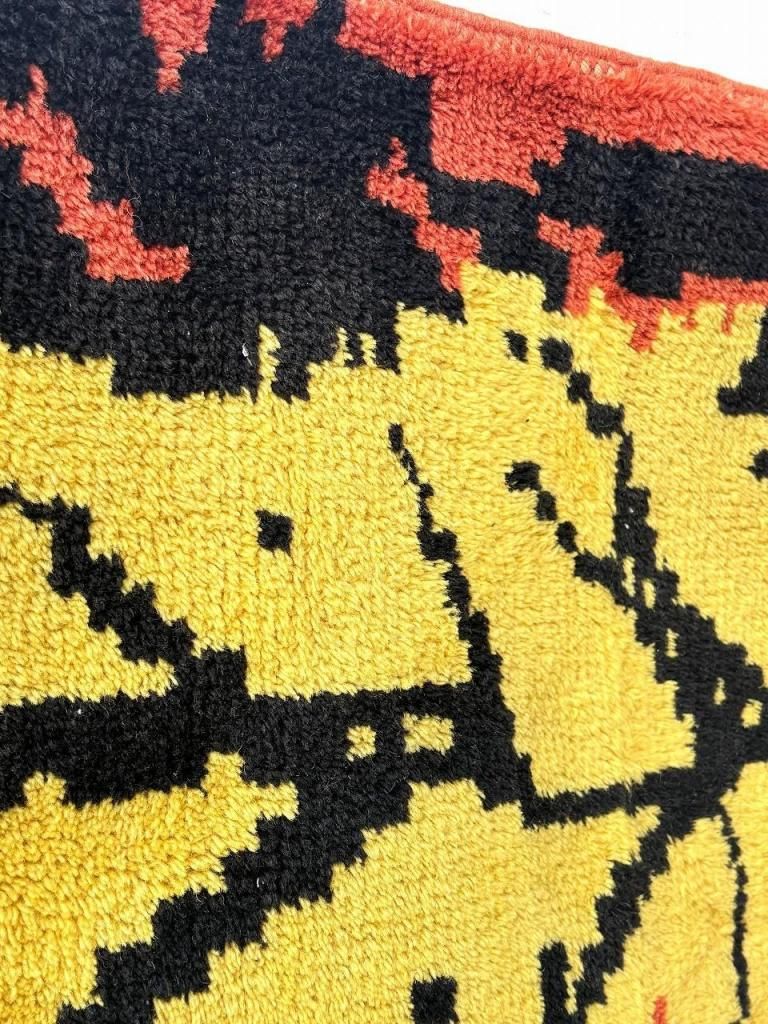温かみのあるオレンジを基調に、イエローとブラックが力強く調和し、抽象化された植物モチーフが印象的に描かれています。